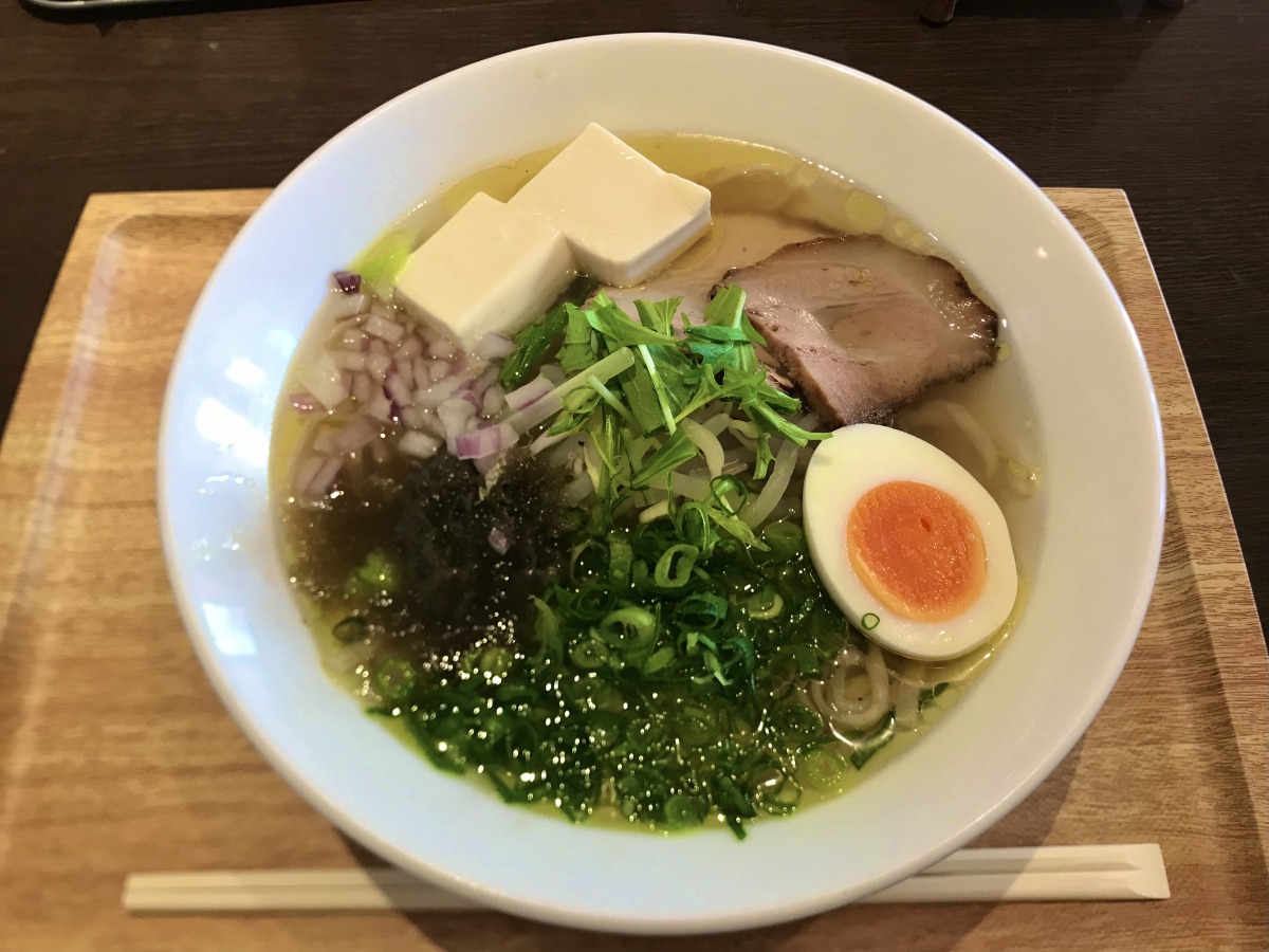 丁寧な盛りつけ、そしてとにかく具がたくさん。豆腐、紫タマネギ、水菜にとろろ昆布……色々な具材がカラフルに盛られ、澄んだスープを彩っています。