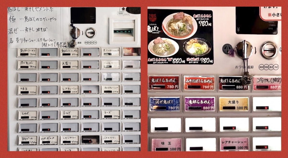 らあめん鬼ぼしの最近の券売機はカラフル(右)になっていますが、オープン当初の味のある券売機(左)も好きでした。雄々しい手書きに興味を惹かれ、ついつい「煮干しのエグいやつ」と書かれた「鬼ぼしらあめん “極” 」ボタンをいきなり押したのですが、今度は時々出現する「限定らあめん」なども試してみたいです。