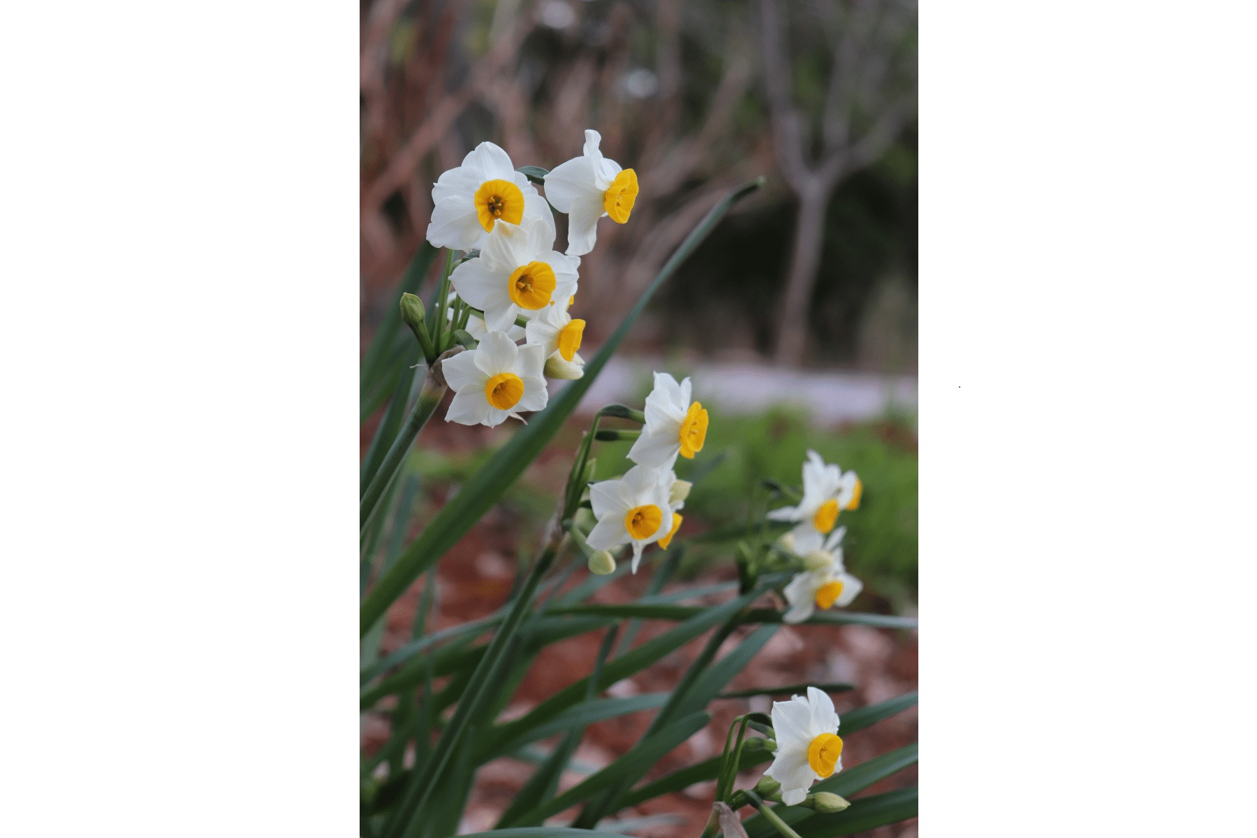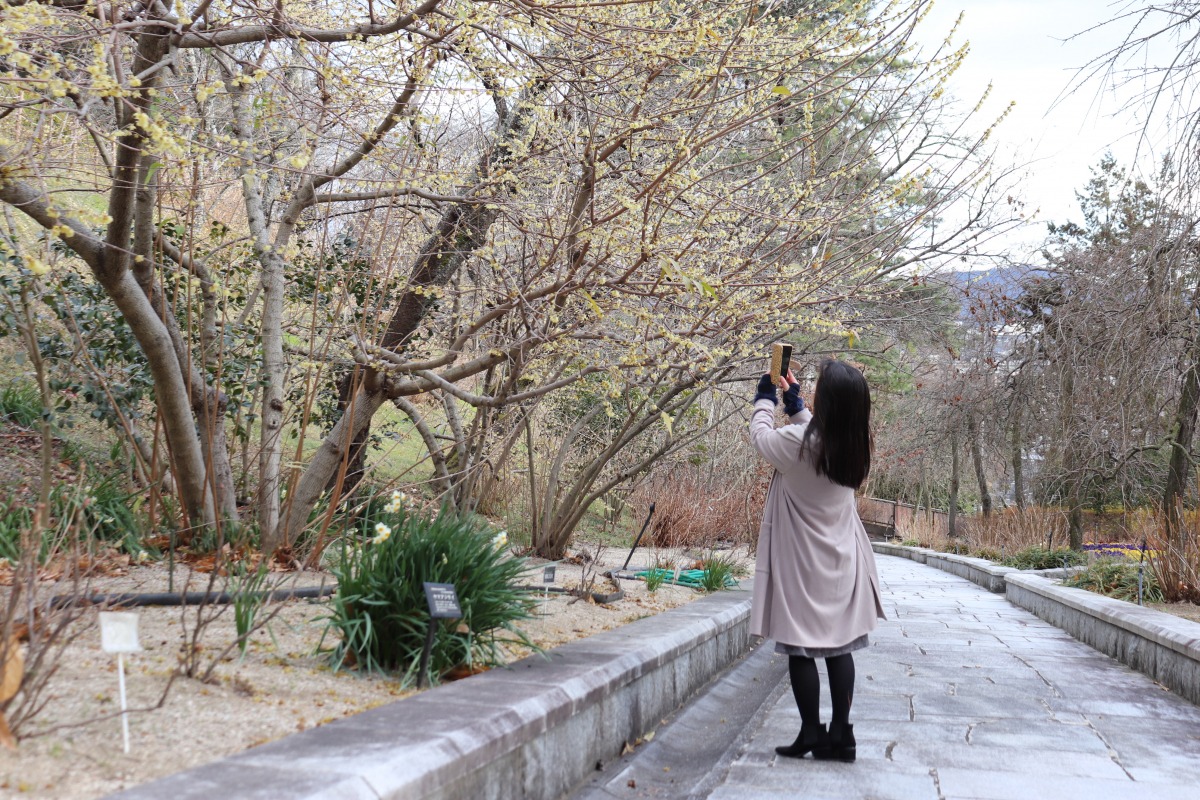 広い敷地の半田山植物園。園内を入るときに渡されるマップを見ながら、今見頃のお花をたどり巡ることができます。寒い冬だから何もないのでは?と思いがちですが、ぐるりと巡れるように冬のお花が咲いています。雪中四友(せきちゅうしゆう)と呼ばれる、雪の中でも咲くお花は、ロウバイ、水仙、玉梅、茶梅ですが、水仙が見頃でした。ロウバイのそばにたくさん咲いているので、イエローに元気をもらえました。