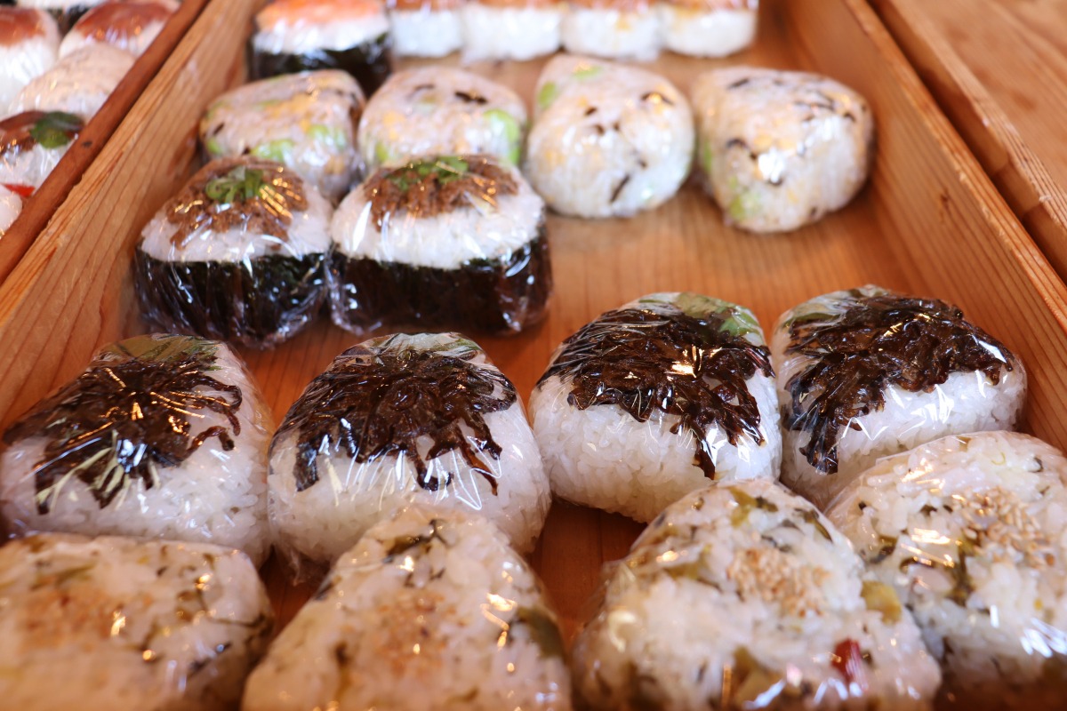 いただいたおにぎりの美味しかったこと! もっと別の味のおにぎりも食べてみたいと思い、平日の午前中に再度行ってみました。行列は無く、2~3人待ちくらいで、おにぎりもいろんな種類が並んでいました! 来たかいがありました。おにぎりは、いちけんファームで採れた「朝日米」。冷えても美味しいので、おにぎりに使われているそうです。塩にもこだわられていて、おにぎりの程よい塩加減が美味しいです。美味しいお米の理由を聞いてみました。香登で採れたお米と、香登のお水で炊くことだそうです。