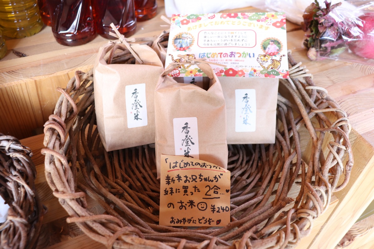 外国で見かけるようなサイズにびっくりしましたが、社長さんにお米作りの事をうかがっていくうちに納得しました。もともとは建設業だったそうですが、香登の田んぼが荒れ地になっていく姿を見て、「生まれ育った大好きな香登の田んぼを守りたい、そして地域貢献したい」そんな想いで、2015年に「農業生産法人いちけんファーム」を立ち上げ、学びながらお米作りを始められたそうです。手ごたえを感じ始めたのは3~4年前。それまでは失敗の連続だったそうです。それでも地域の方に協力してもらいながら、今に至っているそうです。テイクアウト専門のおにぎり屋さん「穂の蔵」がオープンしたのは、2019年7月だそうです。