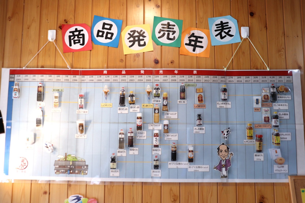 おもしろい年表を見つけました!! 鷹取醬油の商品発売年表です。たくさんの商品の歴史と開発がよくわかります。お店に行かれたらぜひ蔵の壁を見て下さい。
