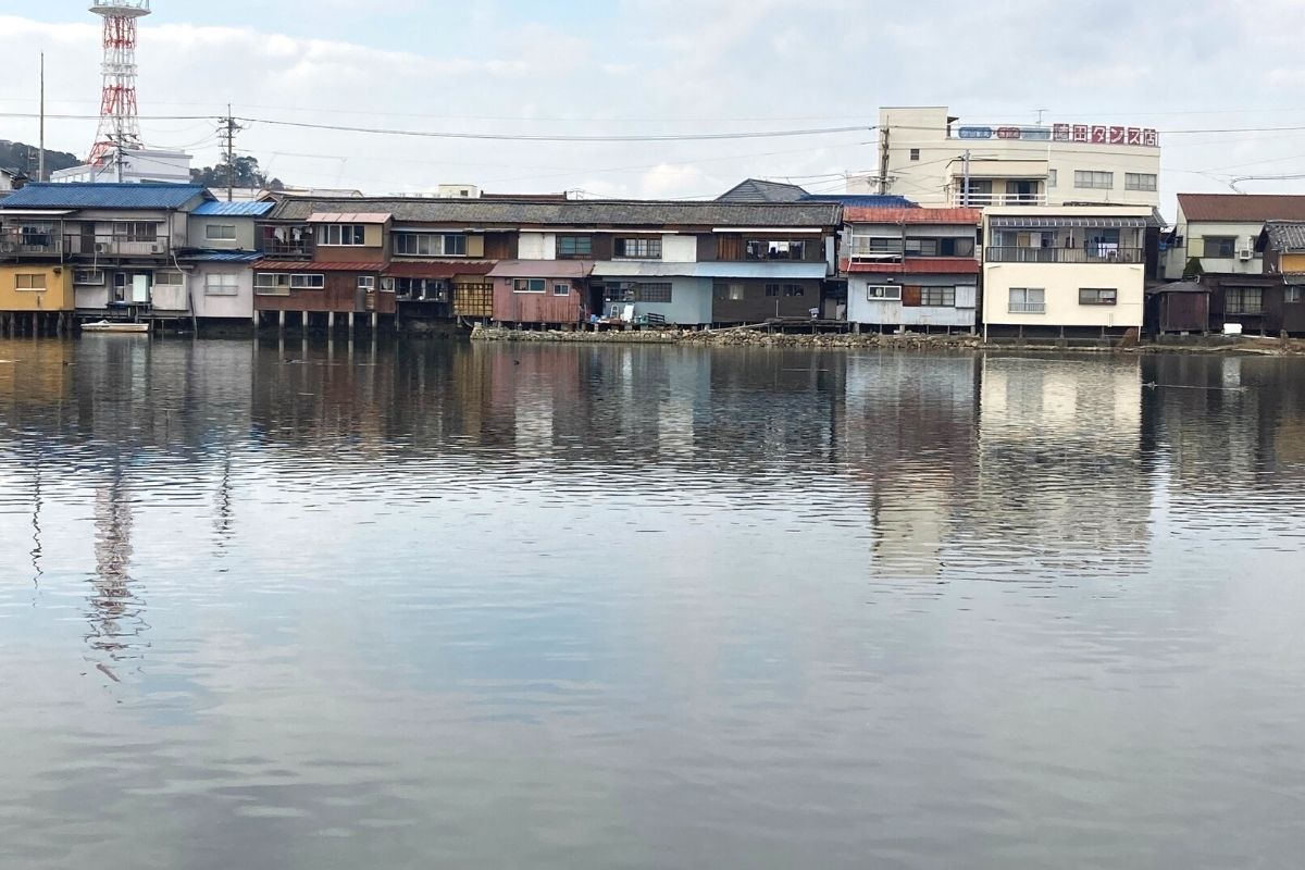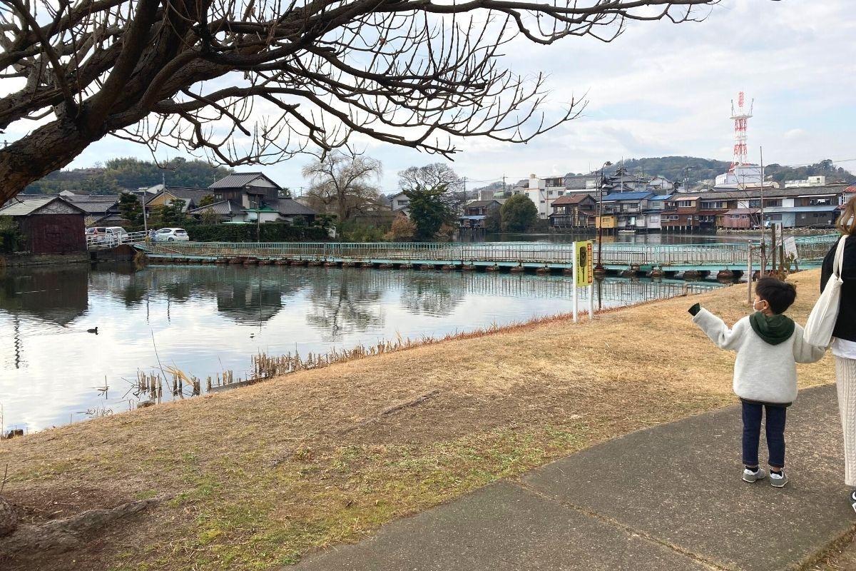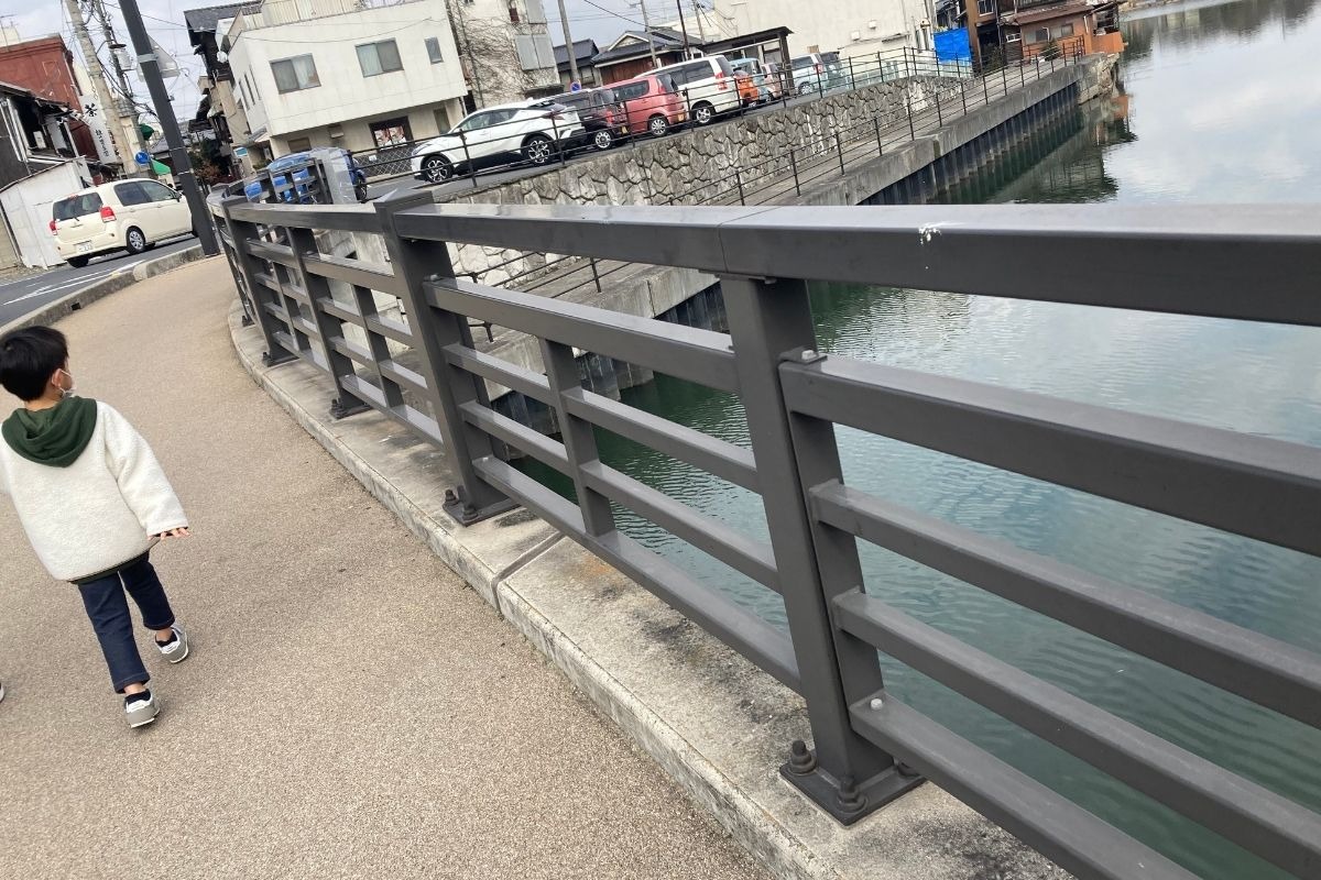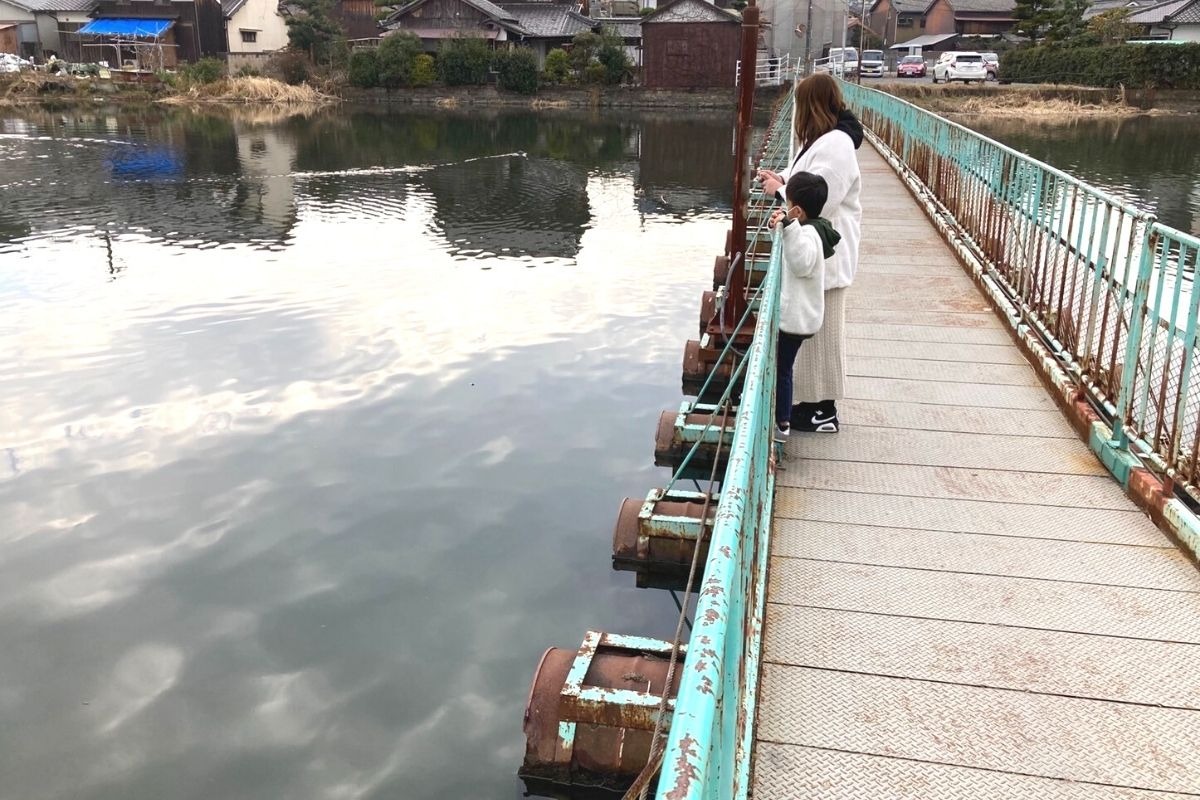 玉島散歩は「ドラム缶橋」からスタート。ノスタルジックな雰囲気漂う景観の中に掛けられた小さな橋は、100個を超える数のドラム缶で浮いた橋。手すりがついており、揺れないような仕様になっています。子どもも怖がらずしっかりとした足取りで楽しみながら渡ってくれました。