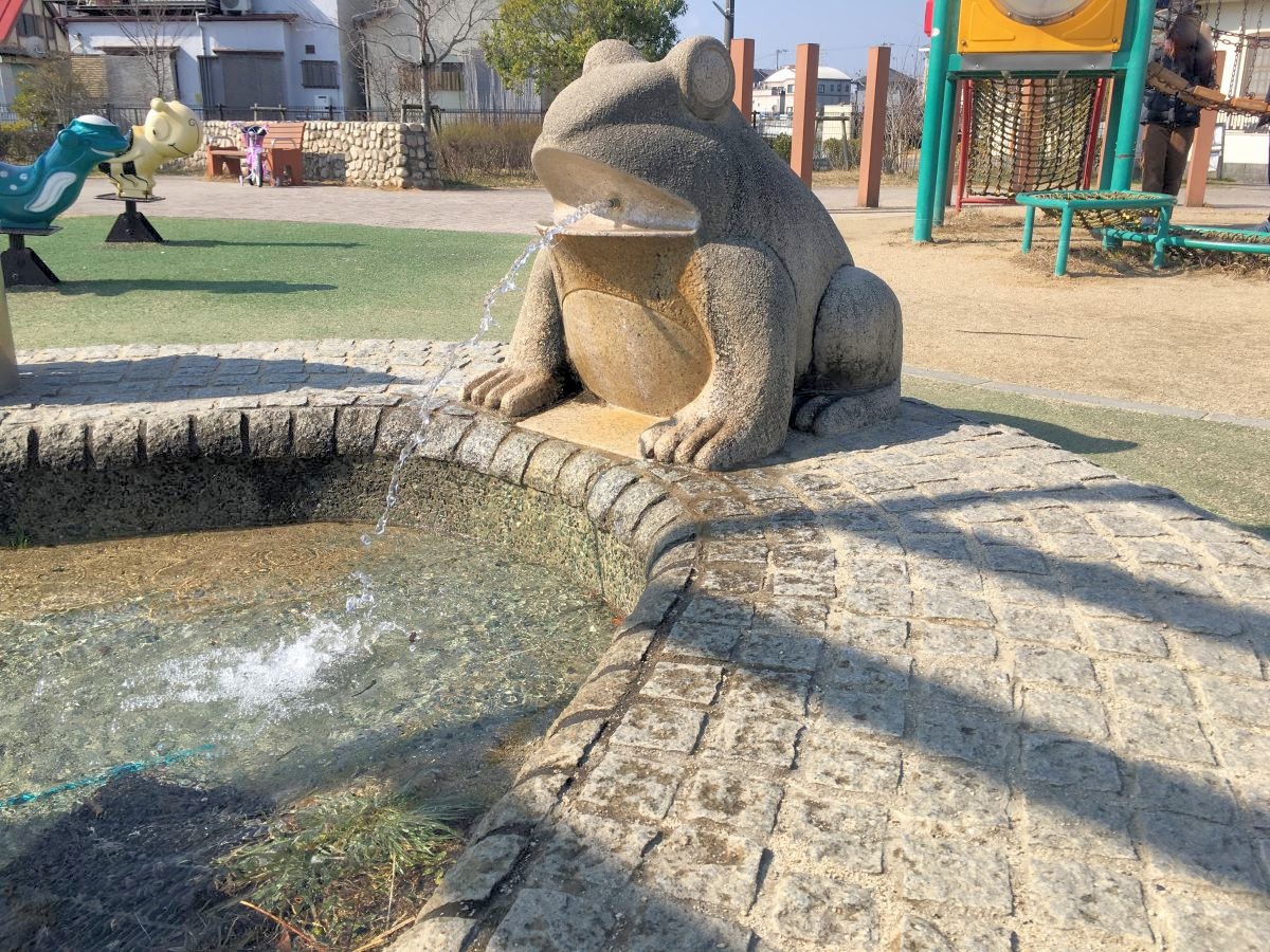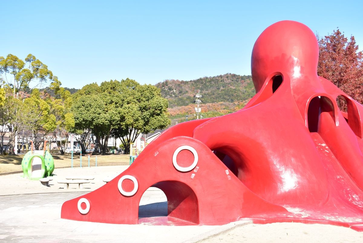 このツヤ感。この曲線。実に良いタコです! 笠岡の山々に負けず劣らずの、なかなかの大きさ。さあどこから滑りましょうか? キノコの東屋、カエルの水飲み場などなど!さすが公園がつくられてからもうすぐ50年。今なお現役のレトロ懐かしい遊具があちこちで見られる、とっても貴重な公園ですよ。