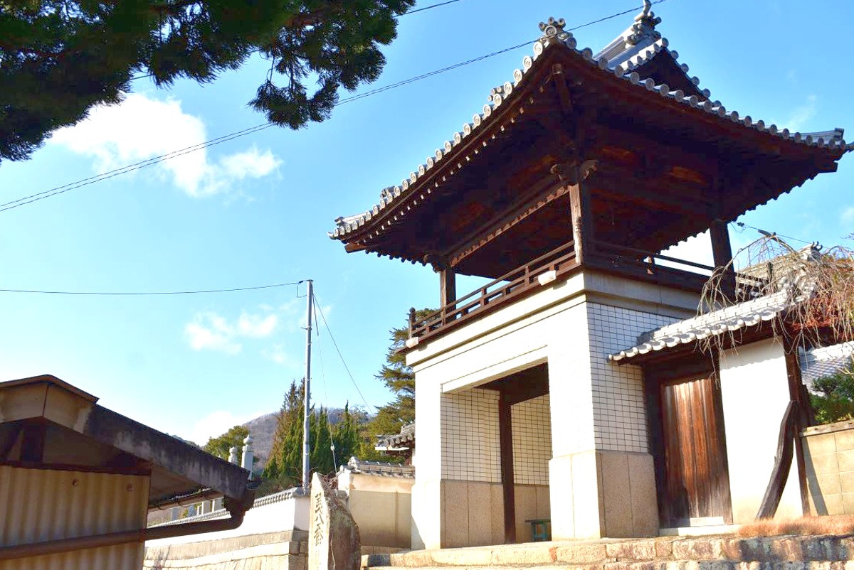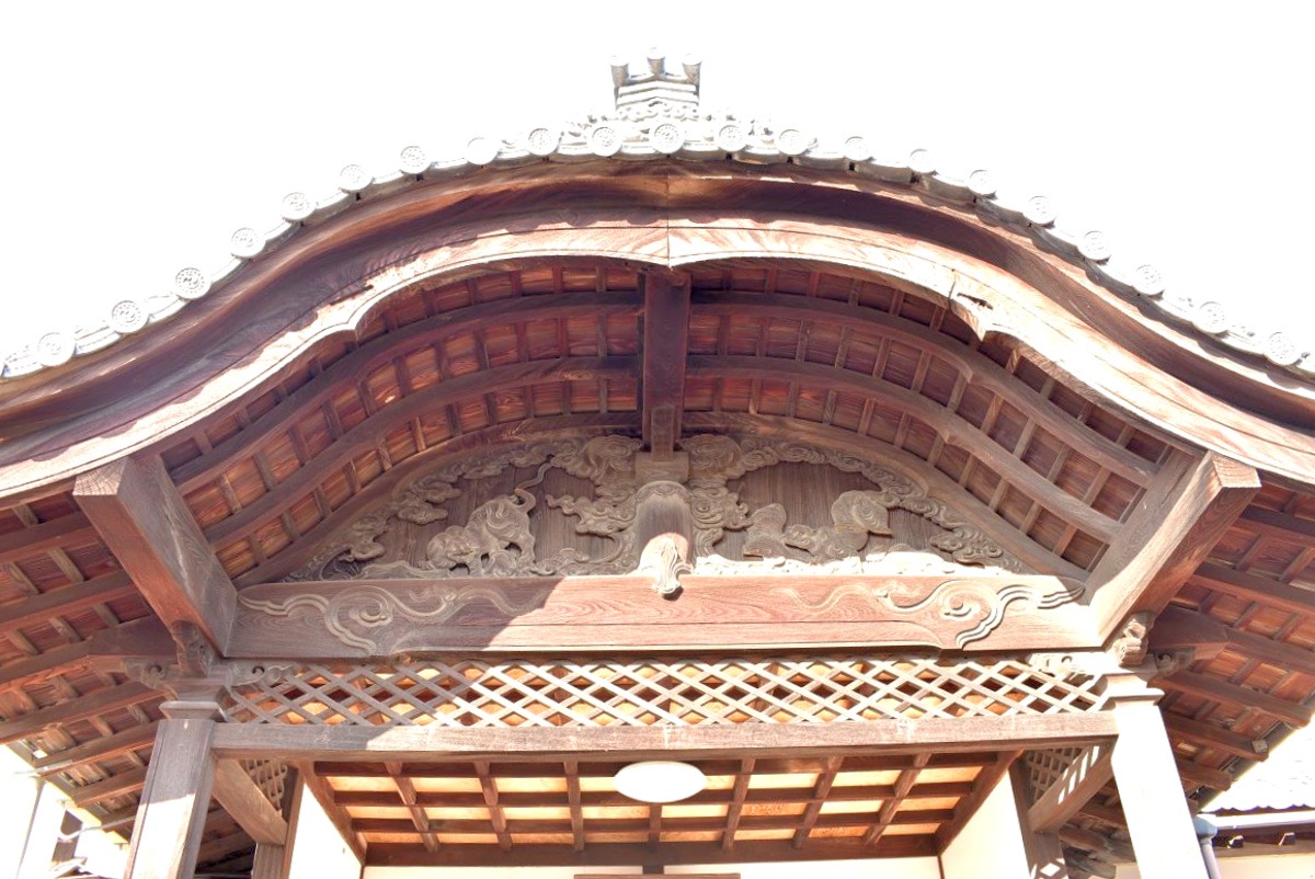 江戸時代後期に建てられた本堂(有形文化財)の玄関も見応えありです!曲線が美しい向唐破風造りの屋根。虎や狛犬の妻飾りの彫り物。主棟にも植物のような装飾が施されていたりと、芸術性の高さも見逃せません。境内の端からは海もわずかに望め、春はしだれ桜。参道には6地蔵。海町玉野の、のどかさにも触れられますよ。