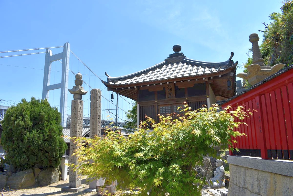 青木(塩飽諸島)から海を渡ってきた基礎石や、自然が盛り込まれた彫刻意匠など。同じく有形文化財の本堂をお参りして、太子堂の方を振り返ってみると、ジャジャーン!広い空に瀬戸大橋がそびえています。これは合成画像なのでは!?と脳が錯覚してしまいそうな、ダイナミックな光景ですよ。重ね重ねありがたや。ありがたや。