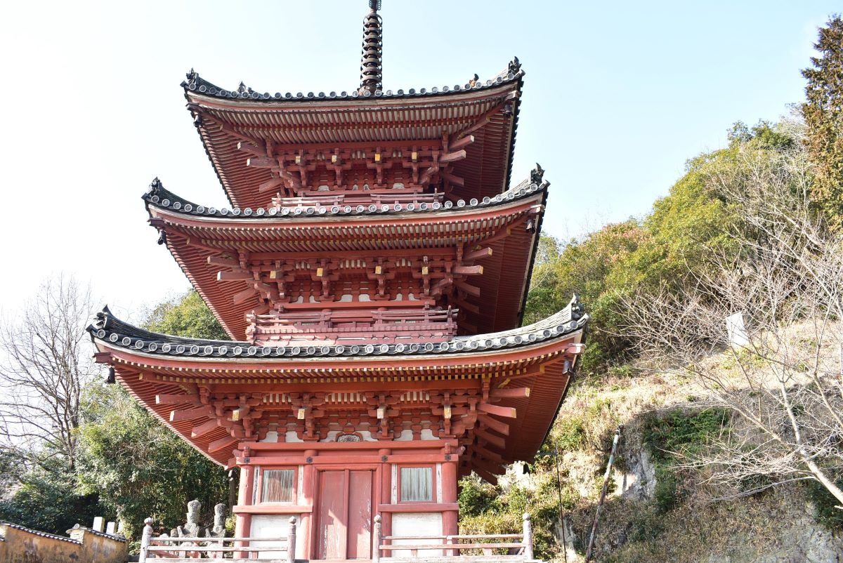 山の背にそびえる朱色の三重塔が、木々の色にも良く映えています!少し低い本堂前から見上げると、18m級の迫力が体感できますよ。鬼瓦。軒下の組物。じっくり眺めたくなる、室町時代中期の古塔(有形文化財)です。梅や桜。観音巡りに、片上の細い路地など。趣もたっぷり。富山売薬の祖とも呼ばれる、備前ゆかりの漢方医・万代常閑の像が出迎えてくれますよ。