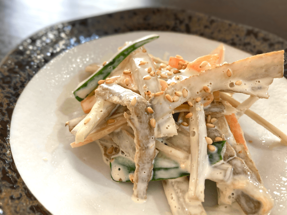 連島ごぼうの特性が活かされた絶品サラダの完成です!お好みでごまをかけて食べてください。