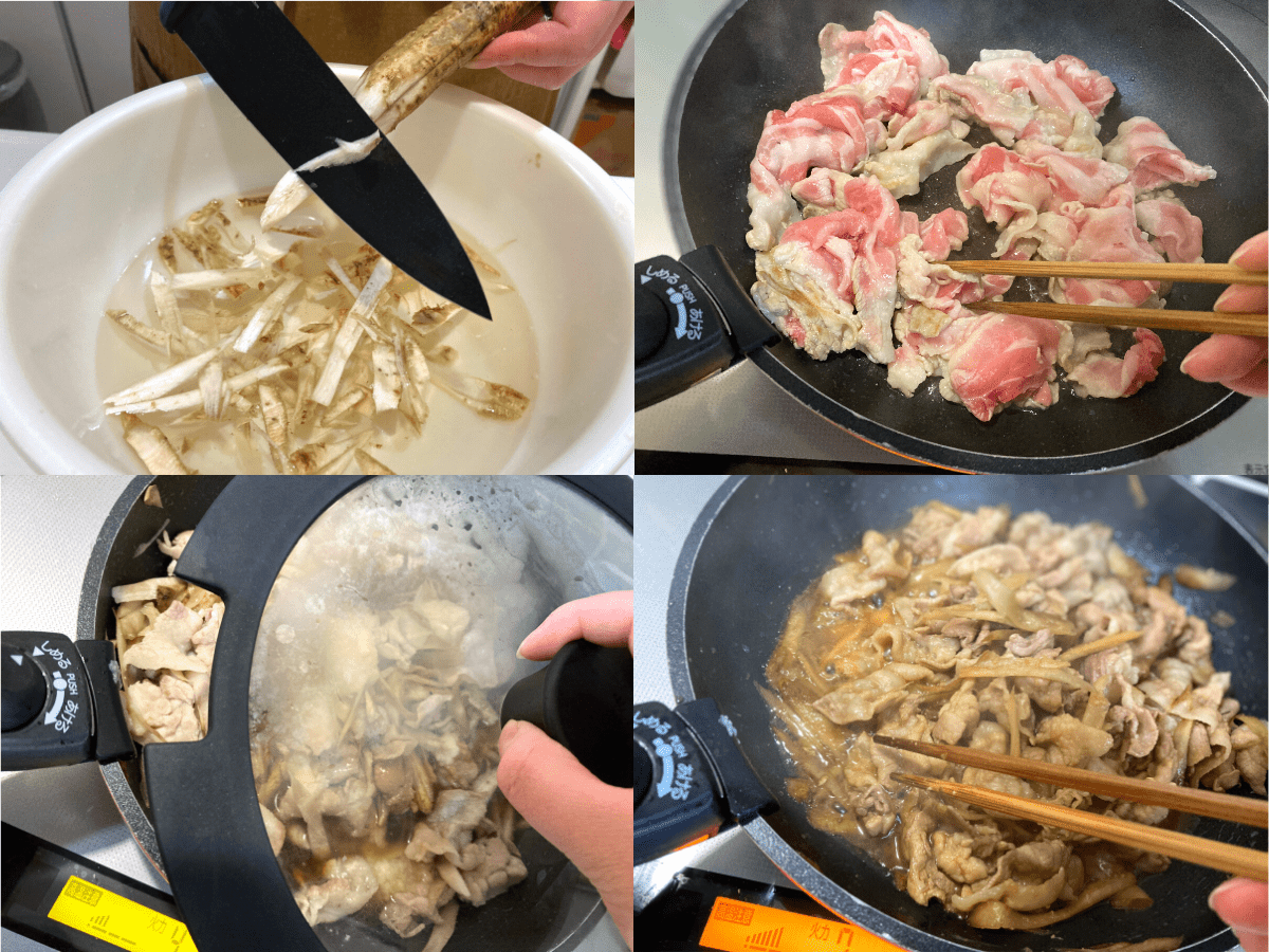 1.豚バラ肉は食べやすい大きさに切る。ごぼうはささがきにして水にさらしておく。にんにくはすりおろす。