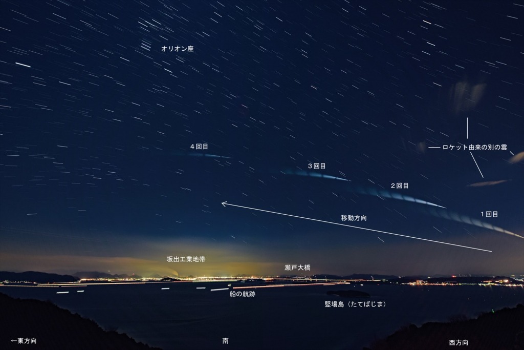そして、この夜には、予想もしなかった風景を見ました。「H-IIAロケット30号機の第2段機体の姿勢制御のためのガスジェット噴射」なるものです。鹿児島県の種子島宇宙センターから打ち上げられた「H-IIAロケット30号機」が地球を1周して、日本上空に差し掛かった時にガスジェット噴射したものです。
