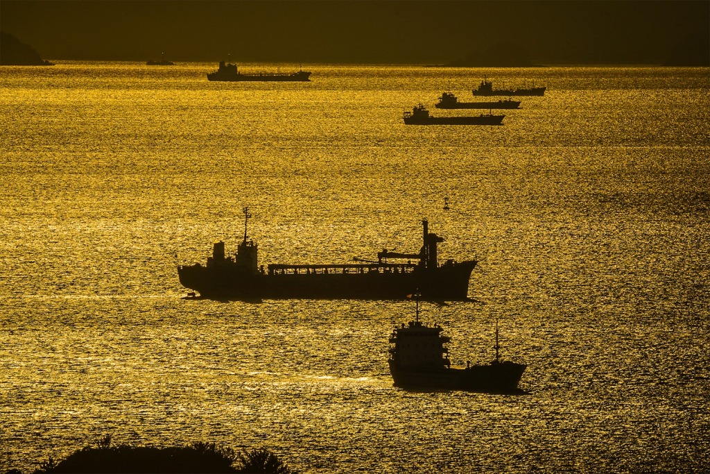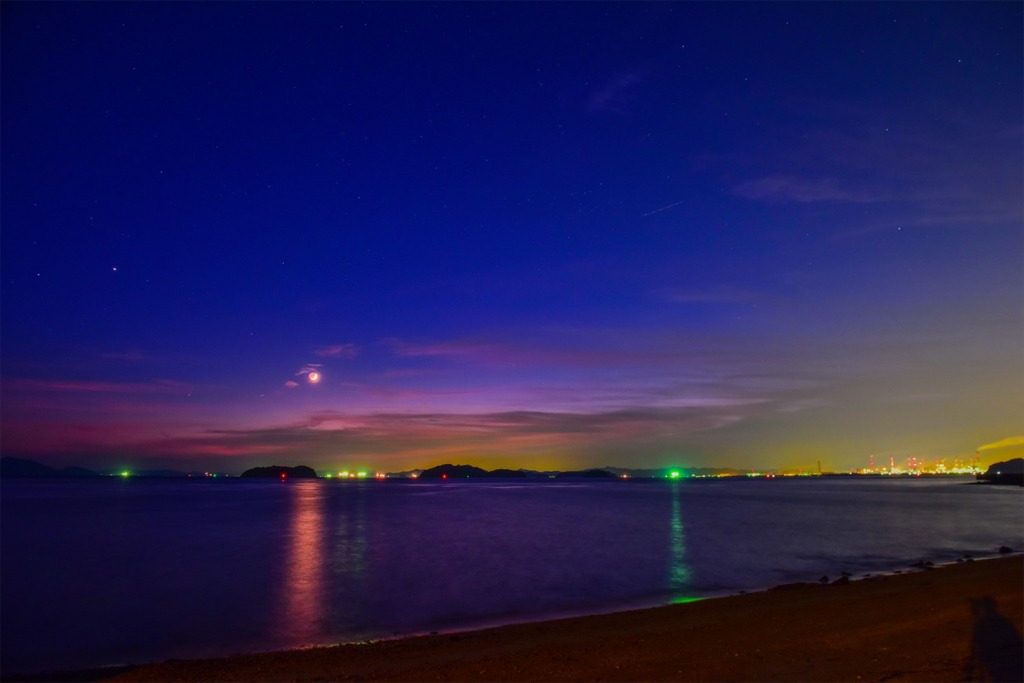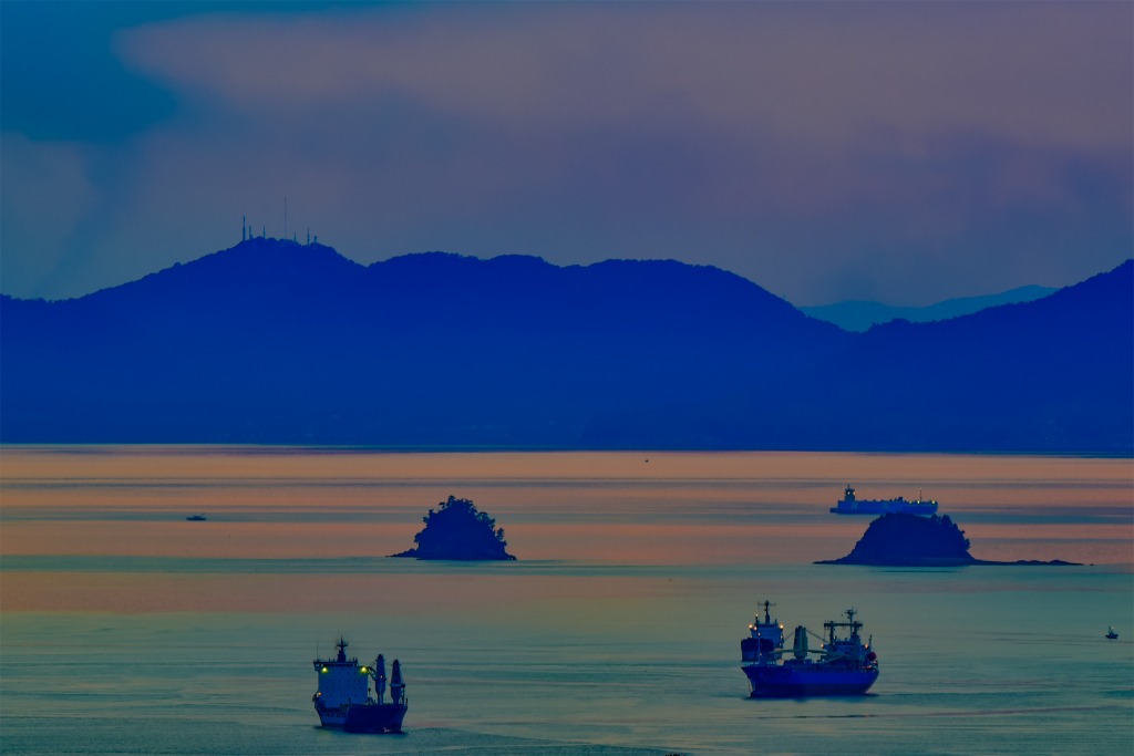 水島港沖の水島灘には、停泊している船舶や航行中の船舶がたくさんいます。船舶の照明が点き始めた時間です。海の表情も良いです。