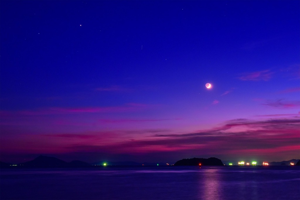 別の日に撮影した写真ですが、空一面に雲に覆われていたのが、みるみるうちに晴れてきて、さそり座の星々とともにさそり座に接近中の火星も見えて来ました。海を行く船が光跡となっており、海流の流れも良い雰囲気です。