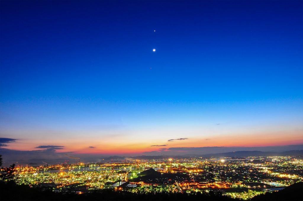 写真には、月や金星などの星も写っており、工場夜景とともに美しい風景を見せてくれました。