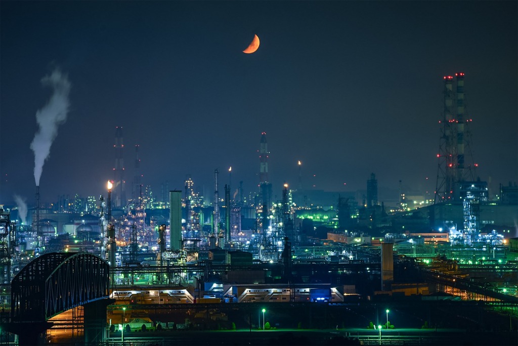 更に暗くなると、工場の明かりがダイヤモンドのように輝き始めます。