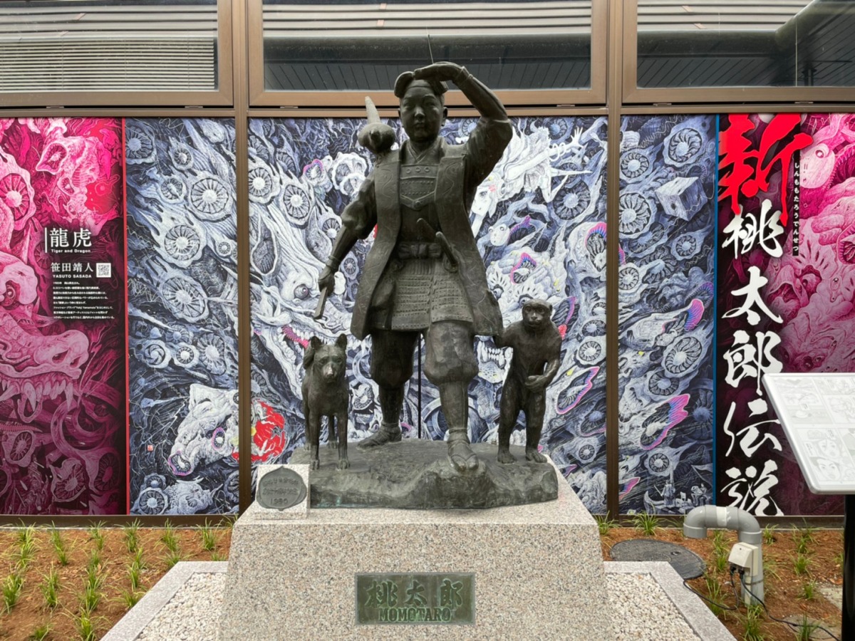 JR岡山駅前の待ち合わせスポット、桃太郎像。実はそちらは2代目で、初代は今、岡山桃太郎空港にあるのです。2021年5月に十数年ぶりにお目見えした像に会えるのは、ターミナルビルの正面入口近く。夜は桃色にライトアップされます。