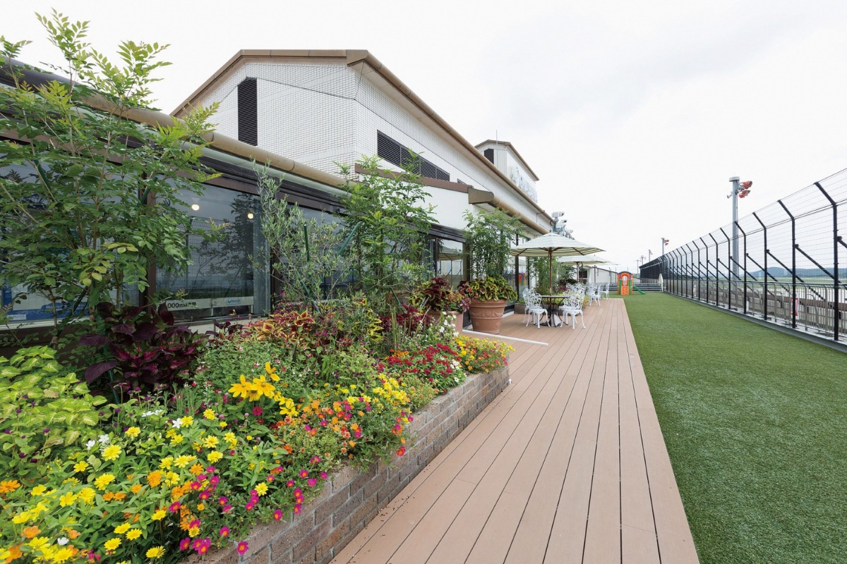 広いデッキにはテーブルと椅子が用意されているので、飛行機を眺めながら寛ぐことができます。人工芝が敷かれ、遊具もあるので子ども連れにも人気です。
