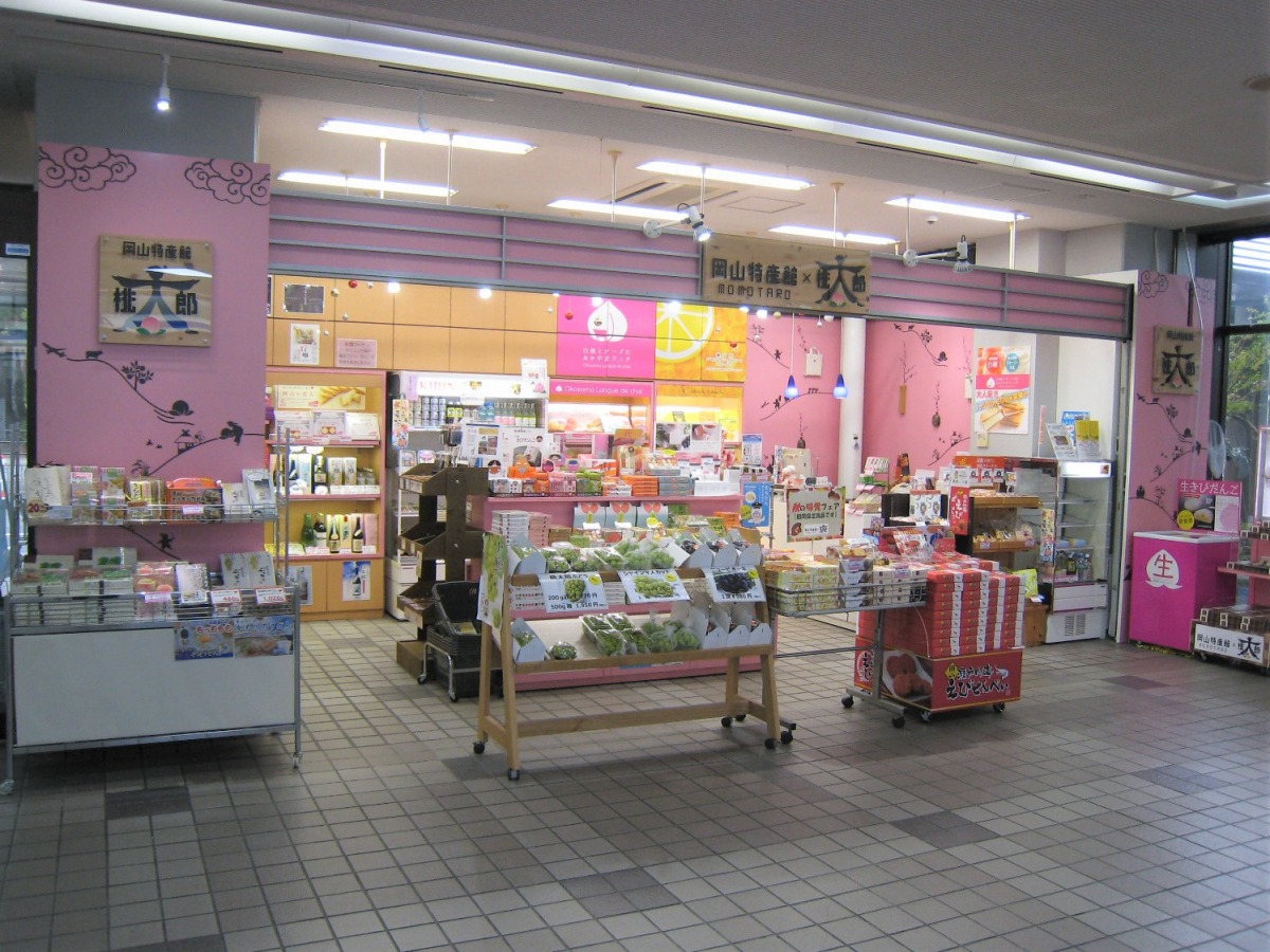 ターミナルビル1階、国内線の航空会社カウンター前にある特産品ショップ『岡山特産館 桃太郎』。桃色を基調にした店内には、きびだんごや地元限定のマスキングテープなど、岡山の美味しいものや素敵なものが並んでいます。