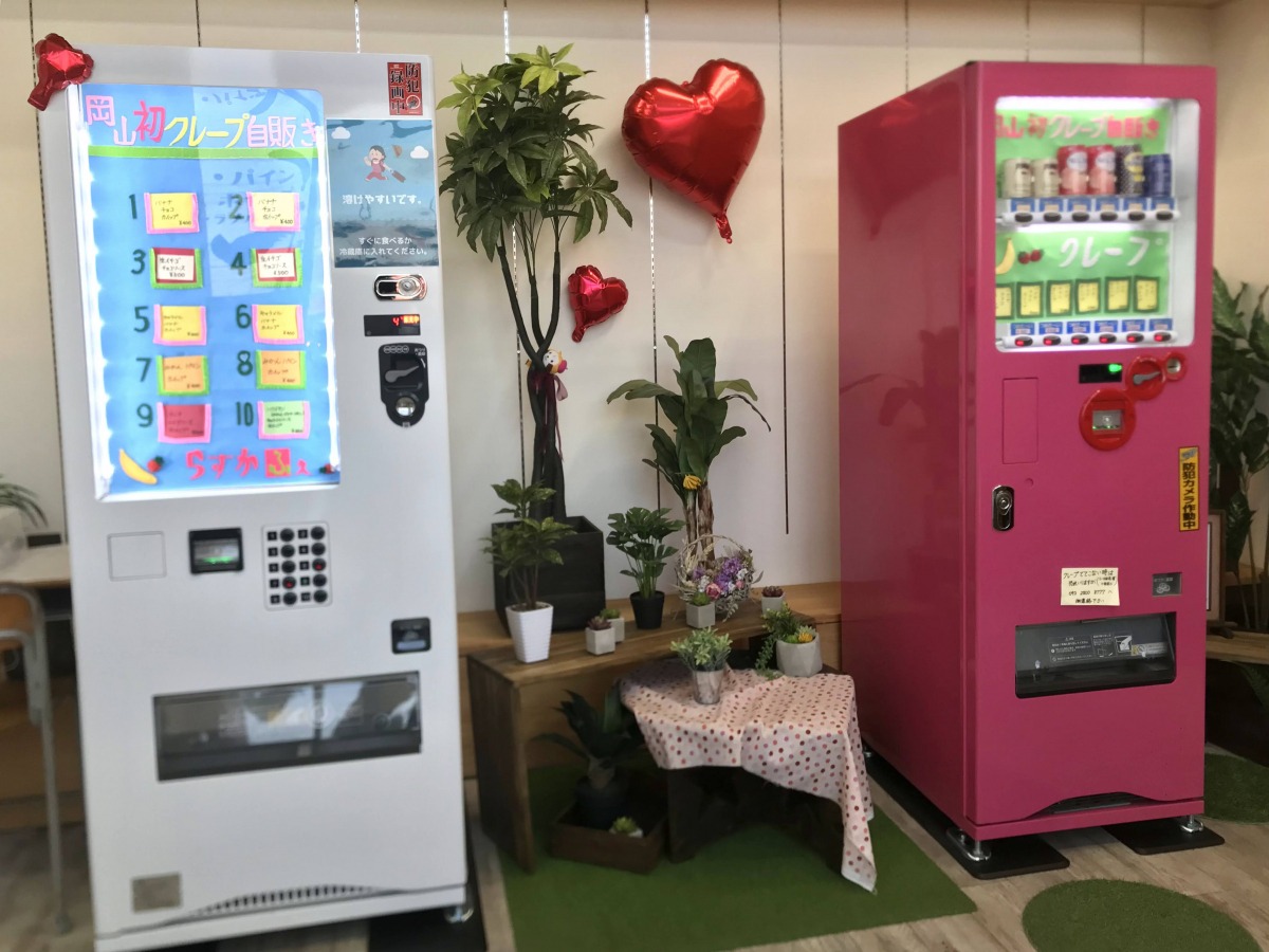 「岡山初のクレープ自動販売き専門店」と書かれたポップな外観。お店のような入口を入ると、カラフルに彩られた2台の自販機が迎えてくれます。