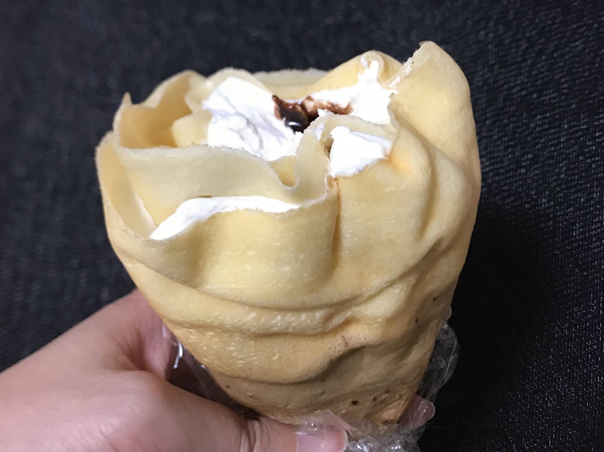 缶コーヒーに続いてガコンと出てきました。一般のクレープと同じく三角の紙筒に入っていて、それが半分折りで袋に包まれていました。この包みを考えた方、すごいですね! 簡単に開けられ、片手でも食べやすかったです。あふれそうなほどの生クリームも満足感がありました。