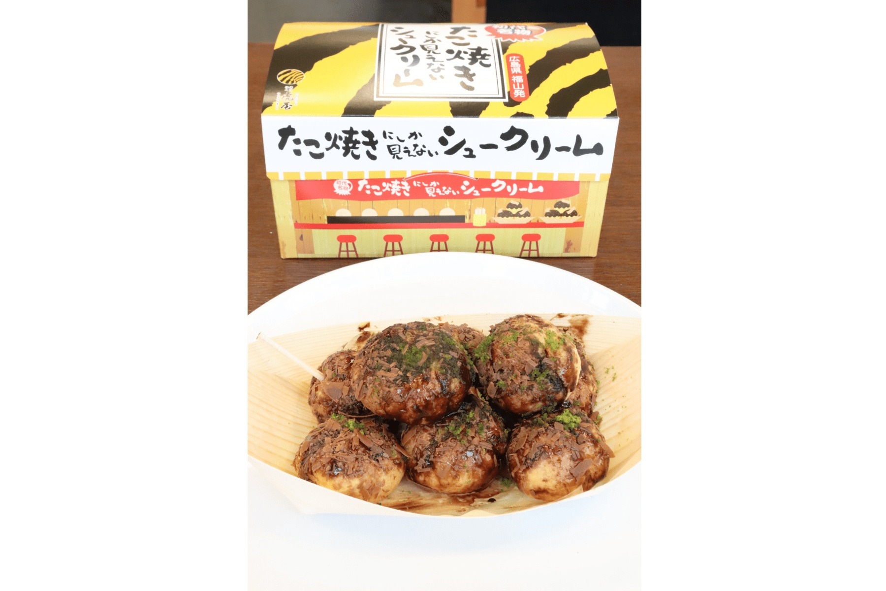 まずは、「たこ焼きにしか見えないシュークリーム」。どこから見てもたこ焼きですが、とろ~り甘いカスタードクリームが美味しい、シュークリームです。ソースはツヤ感がある伝統のショコラソースで、青のりは抹茶、鰹節は薄くスライスしたミルクチョコレート、まさに本物そっくりです。パッケージも本格的で、お花見に持っていきたくなります!(ミニシュークリーム×8粒木船と楊枝付き 税込740円)