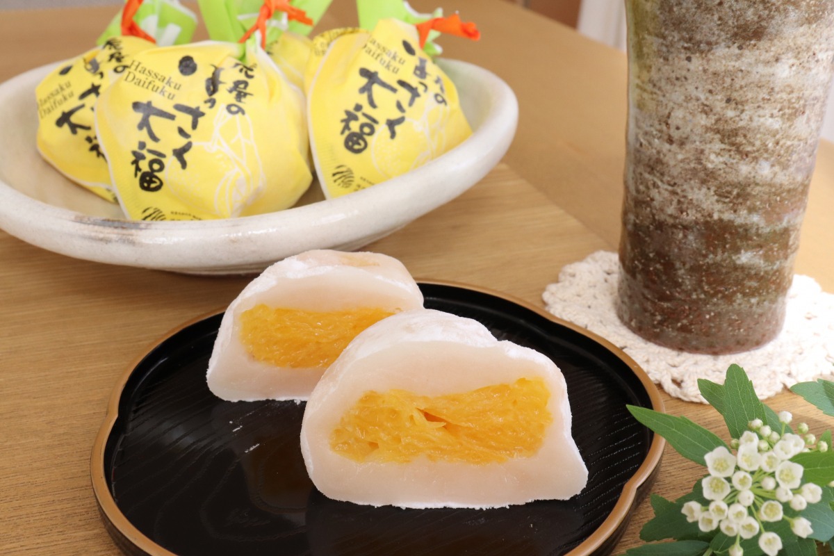 広島県福山市が本店なだけあって、はっさく大福が人気です。冷凍販売されているので、たくさん買って帰っても大丈夫です。国産のはっさくを100%使い、爽やかな甘みと少しの苦み、シャキシャキとした食感が、程よい上品な甘みの手亡豆の餡子と混じり合いくせになる美味しさです。柔らかな果肉を包み込んだもちもち食感の求肥も美味しいです。