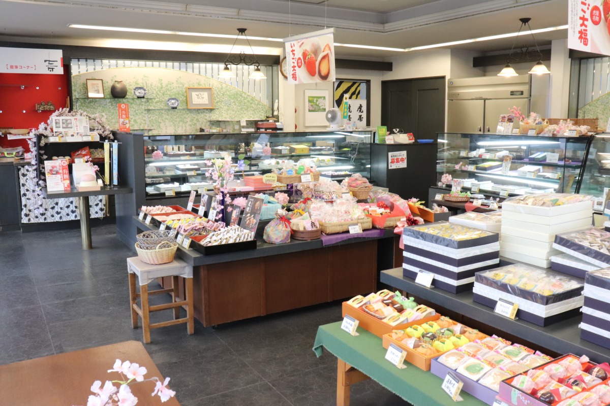 広い店内は、和菓子からスイーツまで色々揃います。おじゃましたのは3月で、お雛様のお菓子がたくさんあり、季節を感じるお菓子も置いてあるので、デイリーに通いたくなりました。お正月には「おせち和菓子」(税込12,000円)もされていて、雑誌やメディアにも取り上げられて人気だそうです。わらび餅で作られた「手まり寿司」は、これからのシーズンにおすすめです。