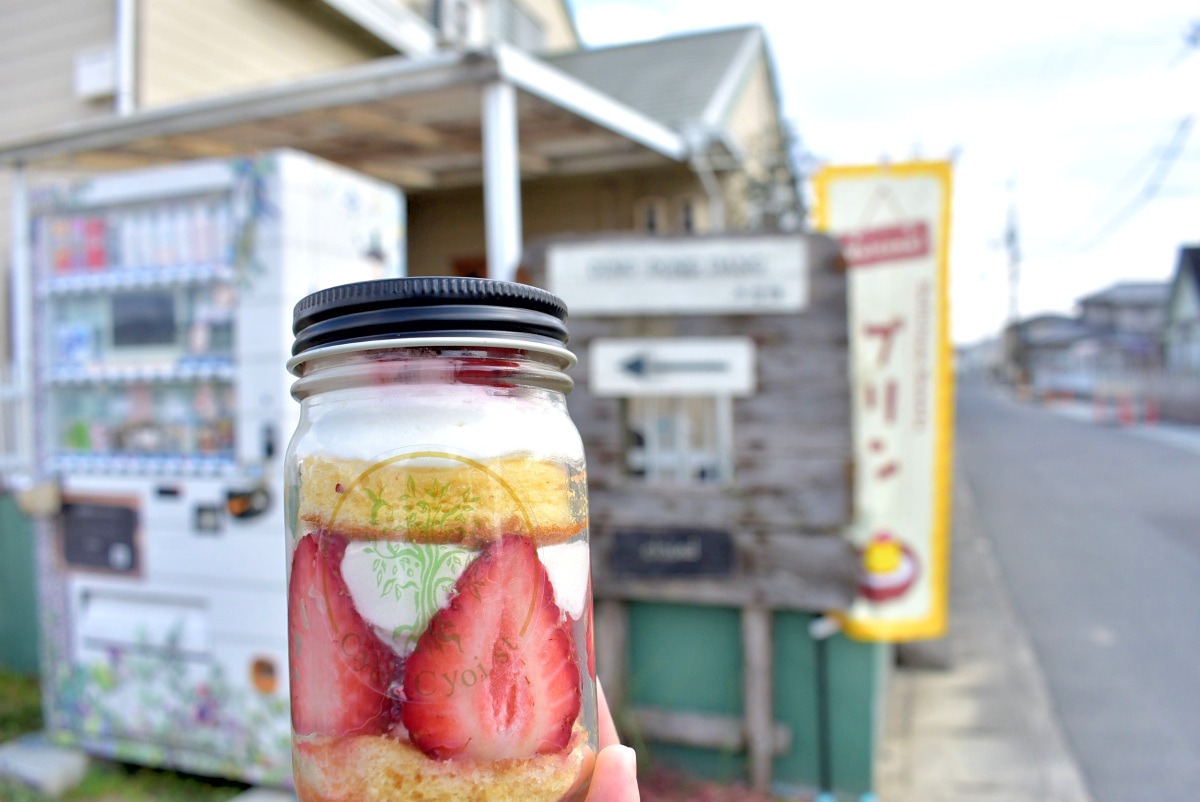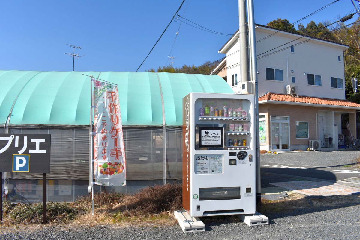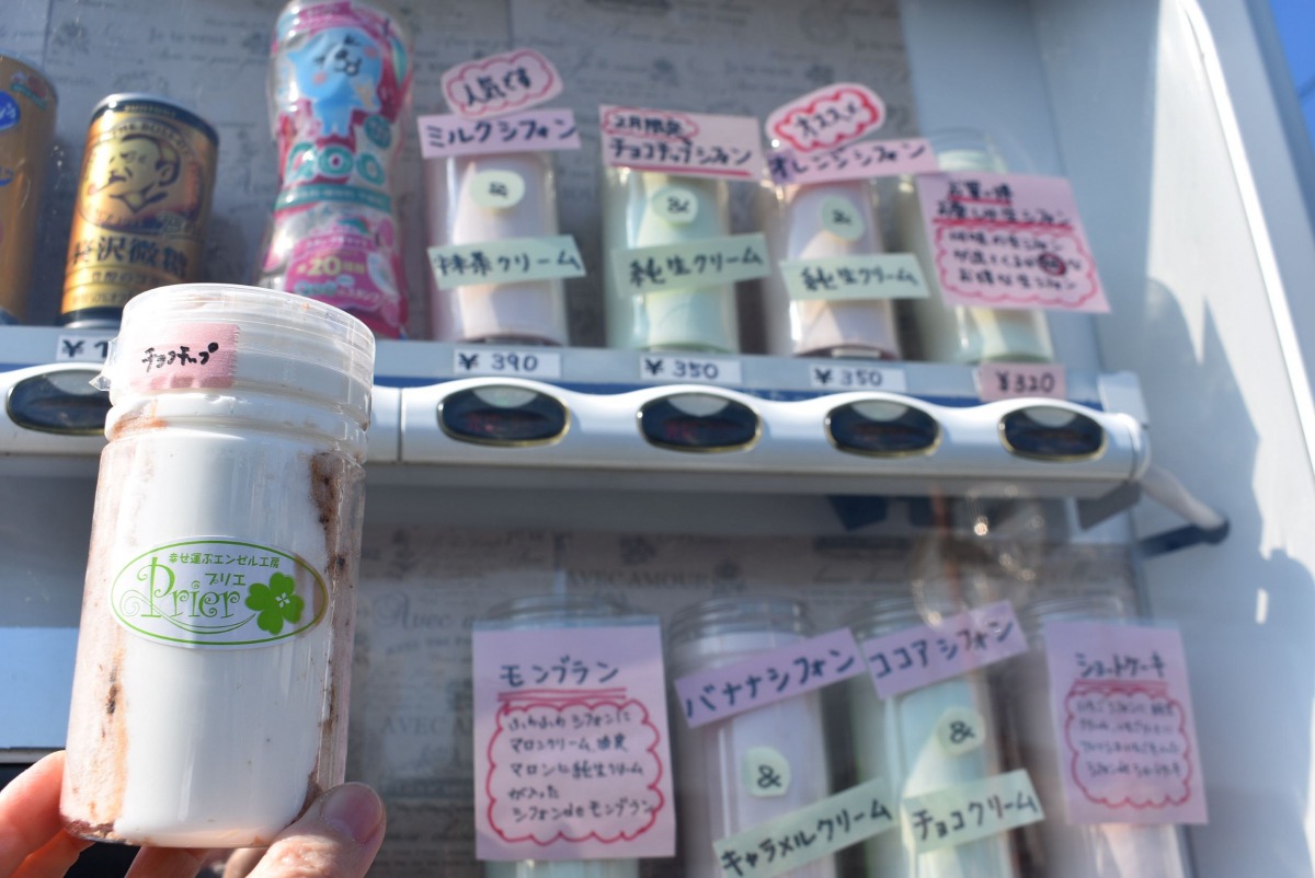 「生シフォン」の文字から本気度が伝わる!自販機(冷蔵)は国道2号線沿いにあります。ミルク、ココア、バナナなどのケーキにはそれぞれ、抹茶やキャラメルなどの魅惑の生クリーム付き!しっとり香り高い生シフォン。エンジェル降りてきますよ。珍しい筒型容器にはスプーンも同封されているので、お好きな場所ですぐ味わえちゃいます。