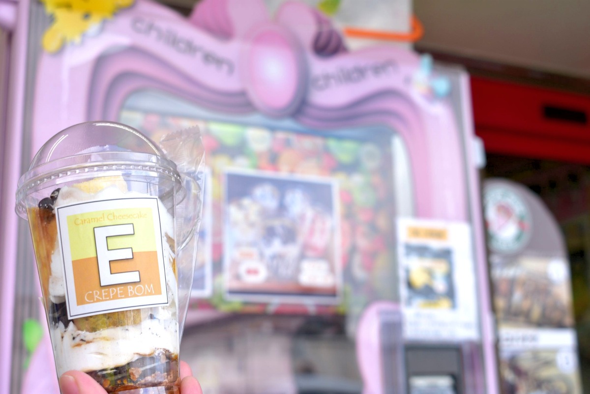 カップに入ったそのままの形で出てきますよ。キャラメルの甘~い香りがたまりません。薄いクレープ生地に包まれていて、生地をカットしやすい形状のスプーンまでしっかり備え付き!ピンク色のかわいいデザイン自販機は、岡山市内にすでに3つも設置されています。