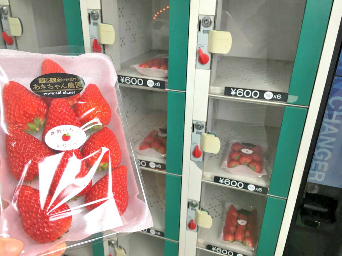 スイーツに欠かせない、甘~いイチゴの自販機も発見!ビニールハウスが並ぶ農園の一角には、真っ赤なイチゴのデザインのかわいいタンクが。無人販売!?というのでしょうか。透明なコインロッカーの中に、農園採れたてのイチゴがずらり。粒が大きくて、鮮度抜群の紅ほっぺでした!5月までいちご狩りも出来るそうなので、公式Twitterでご確認を。