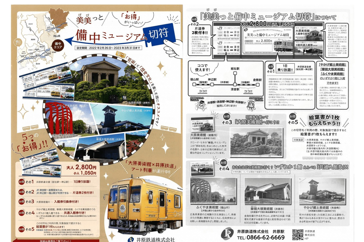 また、華鴒大塚美術館では、井原鉄道を利用して訪れると入館料が割引になるサービスがあります。割引対象としては、週末限定の全線乗り放題切符「ホリデーパス」の提示で入館料100円引き。そして今夏に開催される岡山観光デスティネーションキャンペーンに合わせた、倉敷・福山エリアにある4つの美術館と鉄道乗車券をセットにした企画乗車券「美美っと備中ミュージアム切符」でお得に入場することができます。
