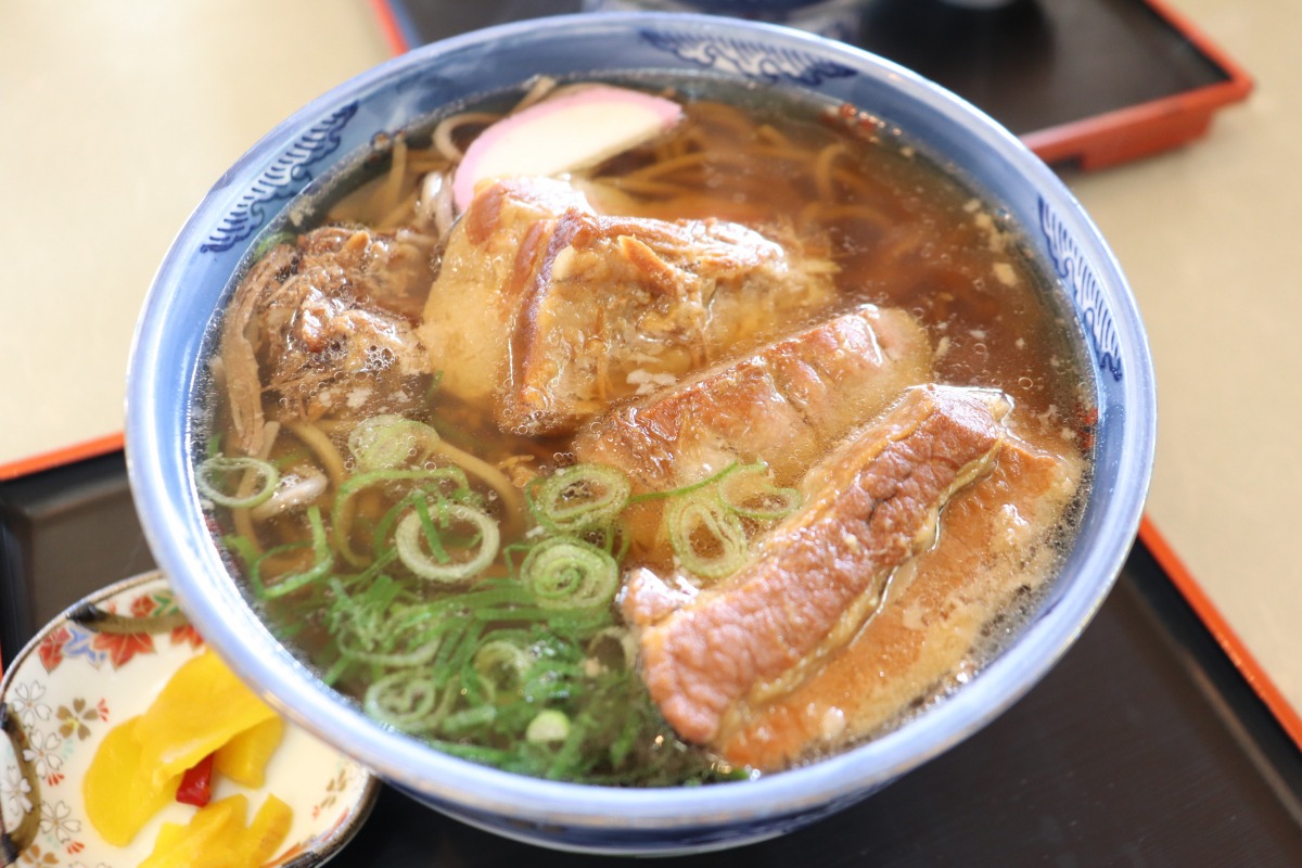 店内のお客様の多くが角煮そば(2個入り1,000円)を食べられていたので、同じく注文してみました。ボリューム満点の角煮が溺れそうなくらいに乗っかっていて、熱々の湯気に食欲がそそられます。豚の角煮は、5時間かけて煮込み、油抜きをされているので、ホロホロに柔らかく、お蕎麦と共に食べれます。お蕎麦は、二八そばだそうです。角煮がボリュームあるので、お腹いっぱいになりました。角煮そば定食もありましたよ。
