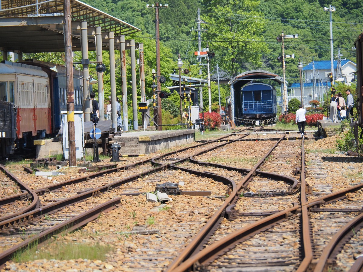 柵原ふれあい鉱山公園は、鉱山の街だったころ活躍していた片上鉄道の吉ケ原駅舎と操車場のあった場所に作られ、車両や線路が保存されています。線路に降りて自由に写真撮影をすることも可能です。