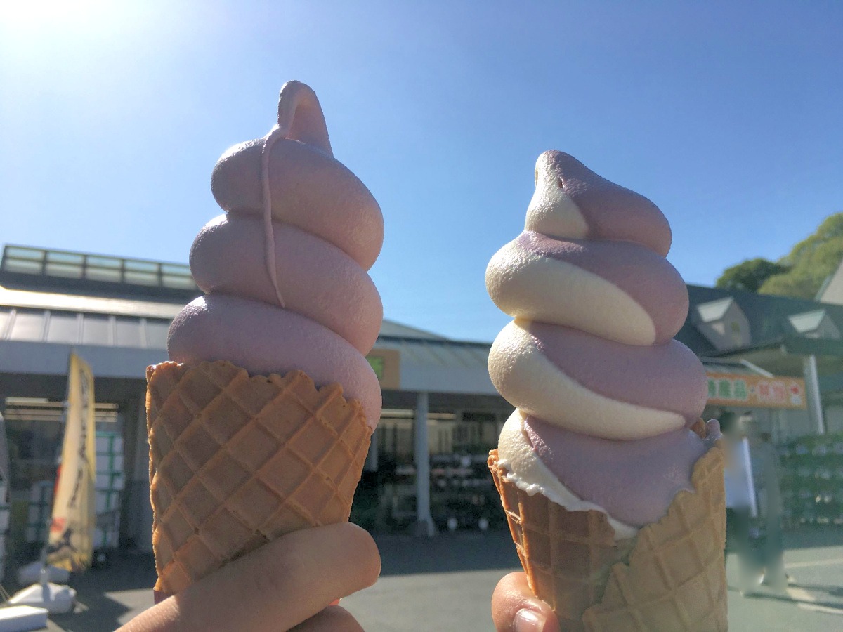 しましまカラーや、もこもこ丸いフォルムがかわいい紫いものソフトクリームです。休日には行列ができることも。鮮やかな紫色、和菓子のような滑らかな口触り、さつまいもをダイレクトに感じられますよ。