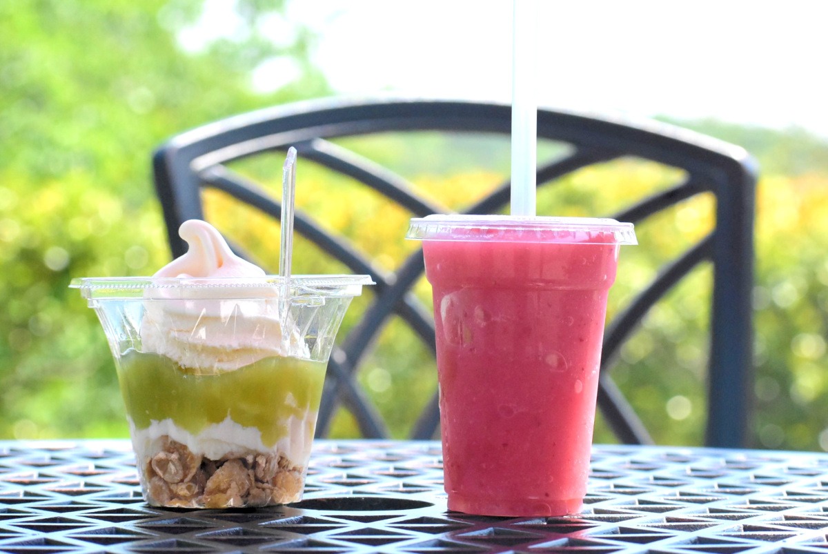 テラス席も、お店の中も、どこを見てもカワイイ!農園直営カフェでフルーツのソフトクリームをどうぞ。シャインマスカット、ピーチ、ブルーベリー!季節限定のカラフルスイーツ。何にしようか選ぶだけでも、顔がゆるんでしまいますよ。仁堀にある観光農園にもカフェが併設されているので、くだもの狩りと合わせて満喫しちゃいましょう!