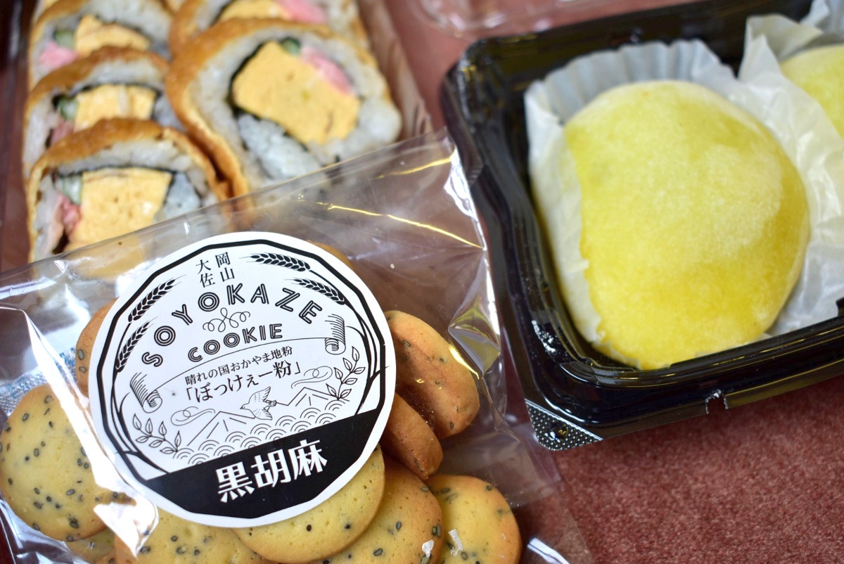県産ぼっけぇー粉のクッキーや、県産もち米のでっかいきび大福など。あれこれ興味が尽きません。
