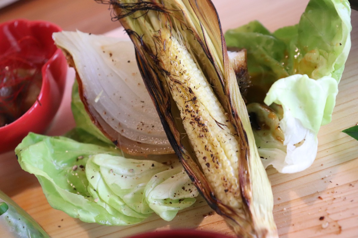 麹の甘酒、金柑のワイン煮、熟成焼いも、白菜のおひたし、スナップエンドウのごまよごしで前菜が最初に出てきました。