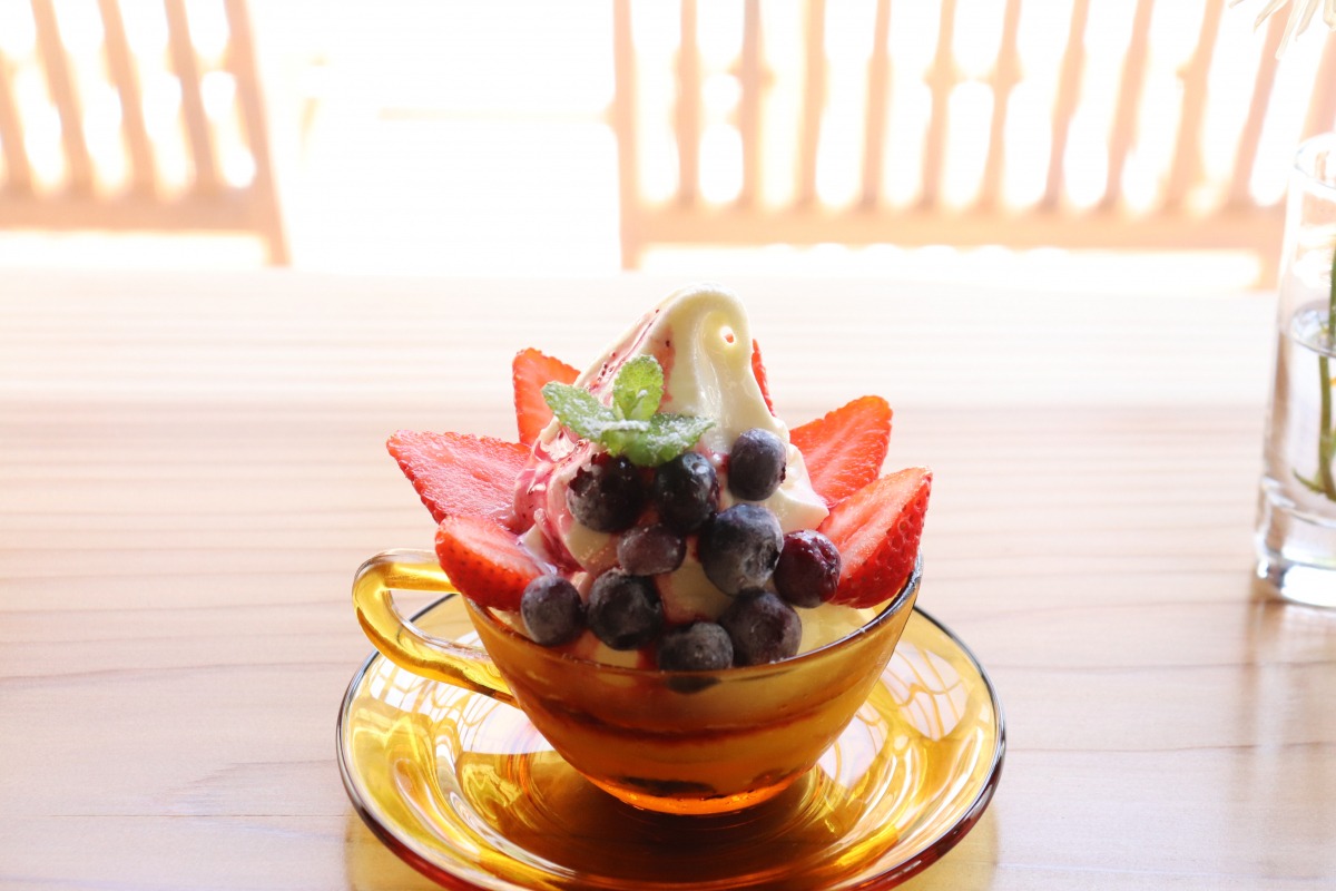 この日は蒸し暑い日で、シーズン初のかき氷を頂いてみました。ふわふわのかき氷は、地下水の美味しいお水から作られています。瀬戸内のフルーツをふんだんに使用した、ジューシーなオリジナルシロップが豊富で、どのかき氷にするか迷いました。カウンター越しに水辺を眺めながら、涼に浸る時間はサイコーです。