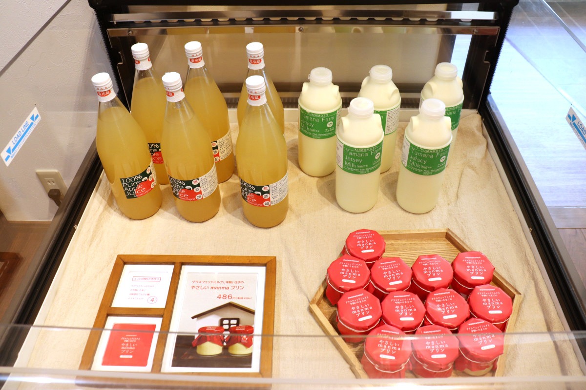長野県安曇野のりんご農家で、2軒しか取得できない長野県エコ認証を取得し、ほぼ無肥料、無農薬で限りなく自然栽培に近い農法で栽培されたリンゴを絞った究極のストレートジュースはお土産におすすめです。前述のグラスフェッドミルクやプリンも人気です。サニーデイコーヒーをオリジナルブレンドしたテイクアウトもあります。