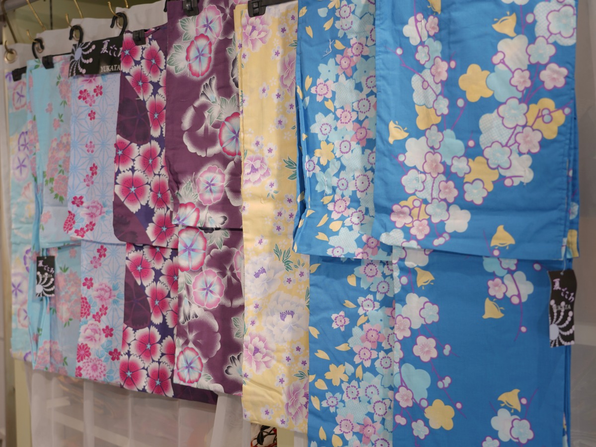 何種類もある浴衣の中から自分に似合う色や柄を選んでもらいます。