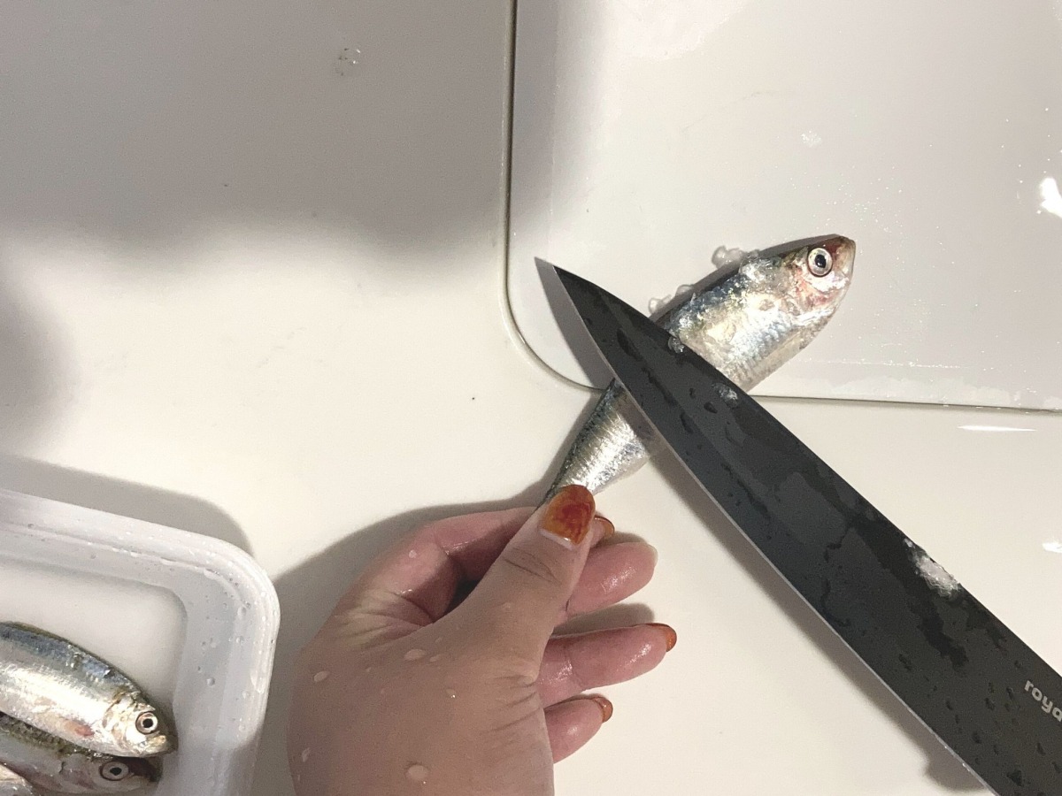①ままかりを軽く洗い、包丁の背を使って鱗をとっていきます。包丁の背を滑らせるようにして、しっぽの付け根からしっかり取り除きましょう。