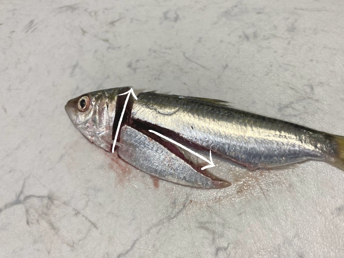 ②鱗をとったら、頭と内臓を取り除きます。このように切れば、魚をさばくのが初めての人でも簡単に効率よく内臓を取り除けますよ。さばく量のままかりがたくさんあるときはこの切り方で時短しましょう♪