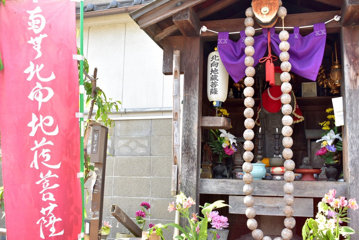 赤色のマントやネックレスがとってもお似合い!大きくってゴロゴロ回せる、数珠の向こうで微笑んでいるのは、北向地蔵菩薩さまです。そして、境内に並ぶなまこ壁の蔵。1つは幕末まで170年余りも庭瀬藩を支配した、板倉家の位牌堂なんだとか。威厳ある薬医門。袴腰の鐘楼など。まずはこの松林寺をめざして、路地めぐりをスタートさせましょう。