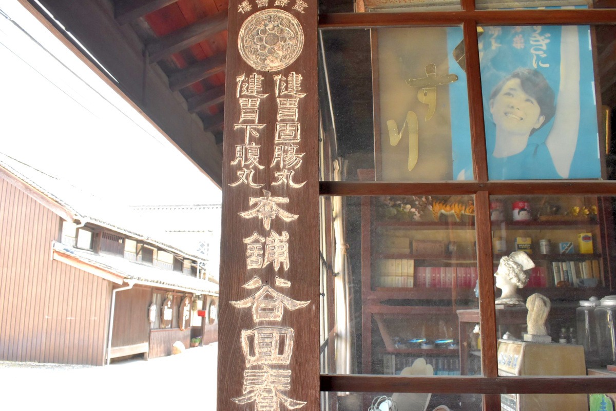 ゆがんだガラス窓や、看板アートにほっこり。アンティークショップのような元薬局屋さん。斜め向かいには、渋~い佇まいの味噌醤油醸造所・川野屋商店さん。庭瀬・撫川界隈には、貴重な建築物が本当に多く遺されていますよ!重厚な黒漆喰ぬりの壁。軒裏の化粧垂木に、犬矢来などなど。歩けば歩くほど、この町の魅力にハマってしまいます。
