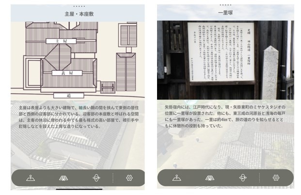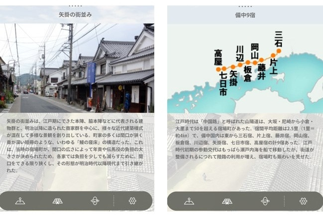 町並みの中にある全22箇所のスポットでアイコンをタップすれば、矢掛町の歴史や文化についてのうんちくを読むことができます。ほかにも、矢掛町の名所の解説を音声付きで聞くことができます。