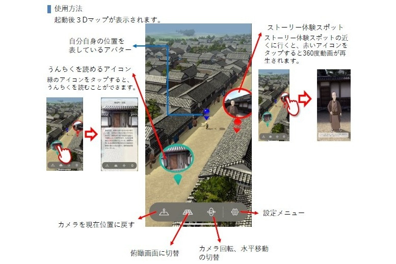 矢掛町の江戸時代の町並みを3Dマップとして画面上に再現! GPS情報を利用することにより自分自身の位置がアプリ上で表示され、歩くとアプリ内の3Dマップ上の自分自身の位置を表しているアバターも連動して移動。3Dマップ上にはストーリーを体験できるスポット(旧矢掛本陣石井家、旧矢掛本陣髙草家ほか、全4箇所)があり、実際にその場所にたどり着くと360度パノラマ動画が再生できます。360度どの方向を見ても町並みを鑑賞できて、臨場感は抜群です。