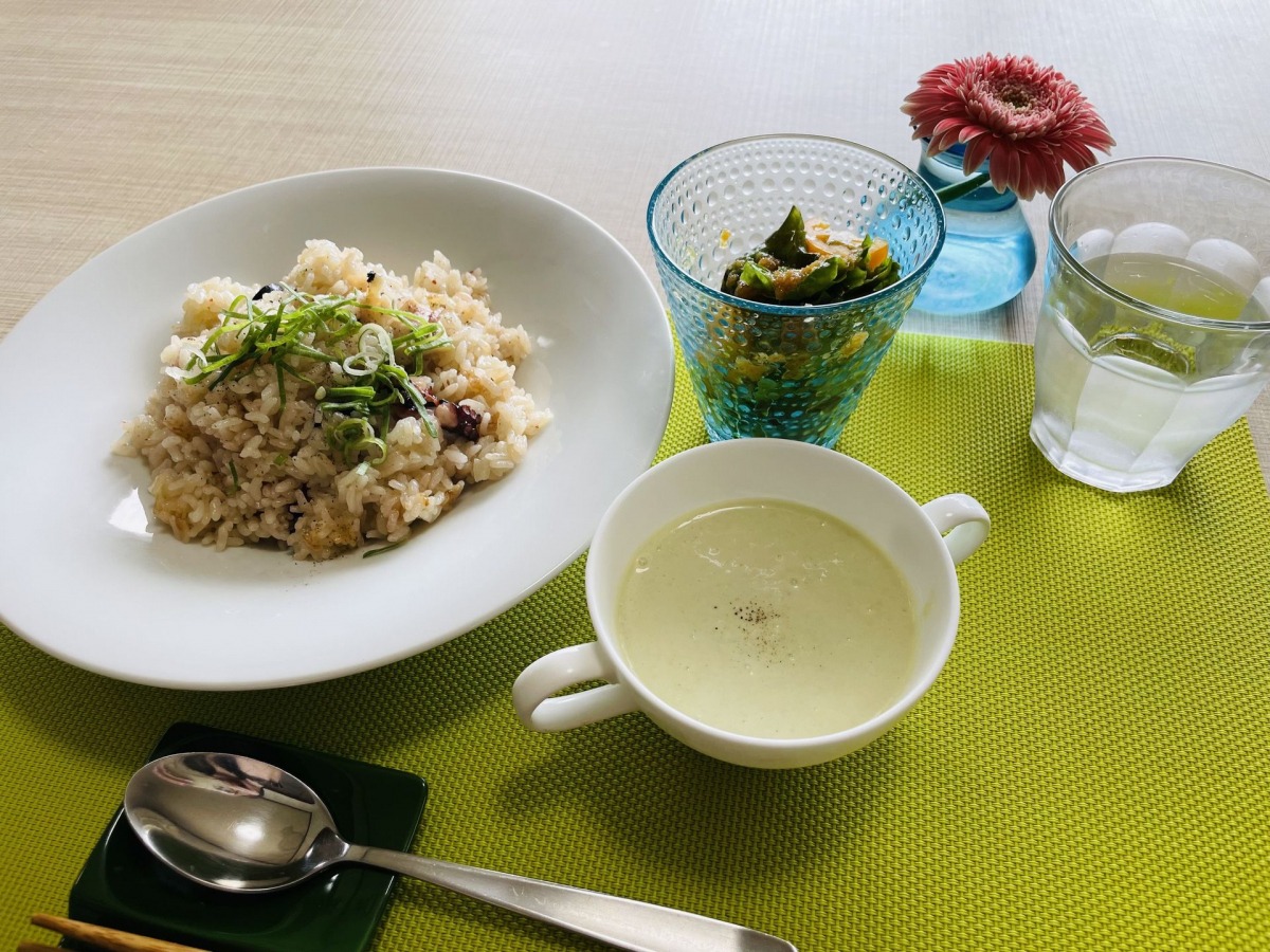 ランチはタコ飯、スープ、サラダ、ドリンクでした!