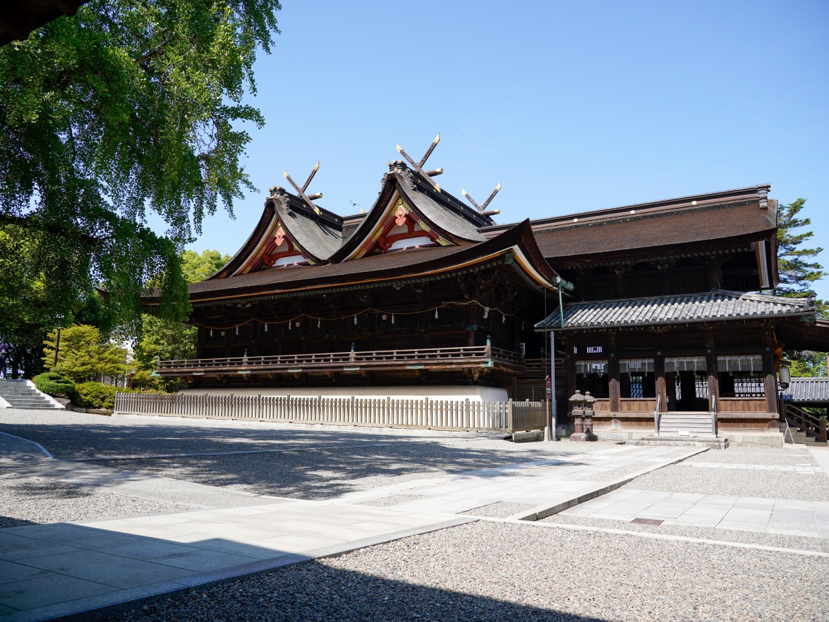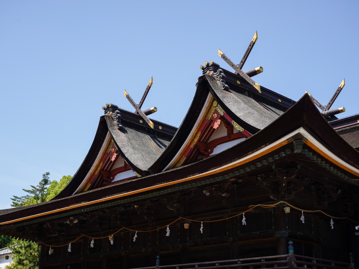 神社の見どころは、3つ。1つ目が、『比翼入母屋造』の本殿・拝殿(国宝)。全国でも珍しい建築を見ることができます。2つ目が、廻廊です。全長約400mの廻廊は、自然の地形をそのままに、しなやかに一直線に続いています。そして、3つ目が『鳴釜神事』です。