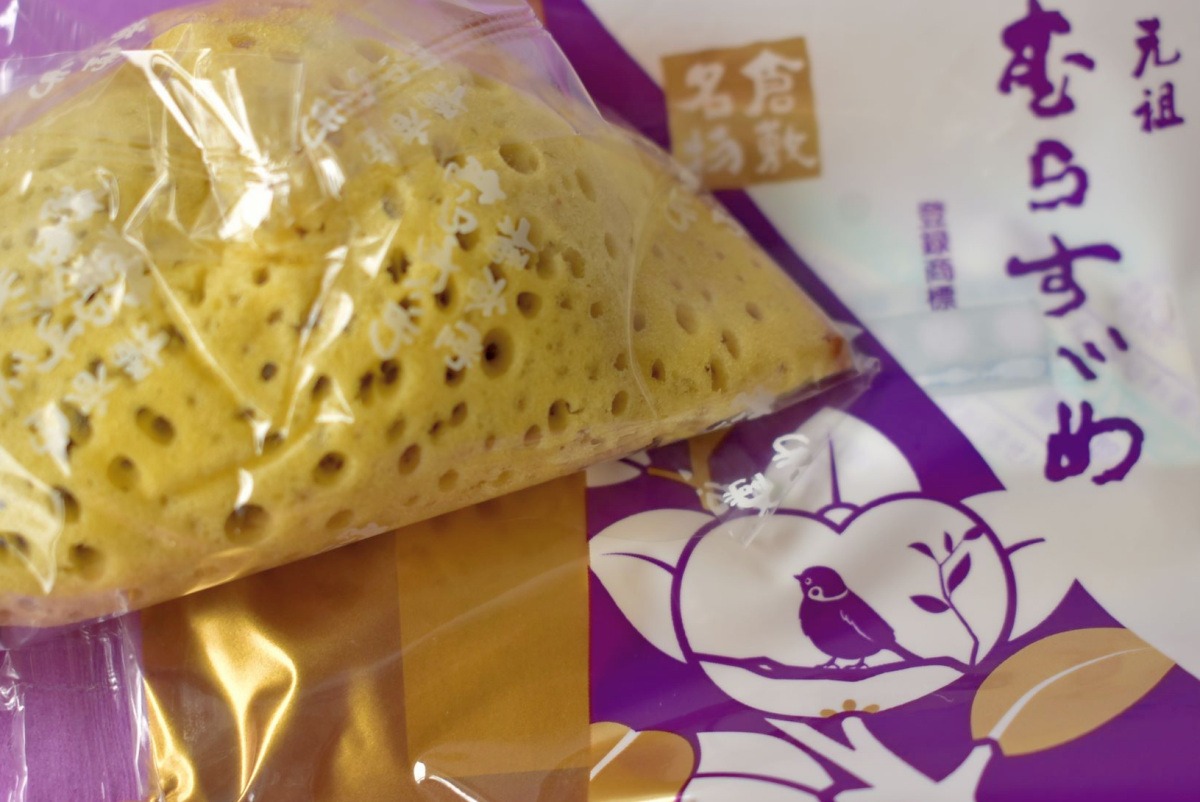 あんこの粒々がクレープのような生地に包まれて。編み笠、稲穂、スズメ。のどかな岡山の風景が浮かんできそうな、倉敷市民熱愛の銘菓です。紫✖ゴールドの、可愛くって上品な包装にはマチが付いていて、フワフワ生地を守っていたり。4代にわたる伝統と、創意工夫がつまった「メリケン」菓子。ノスタルジックな世界観にほっこりしますよ。