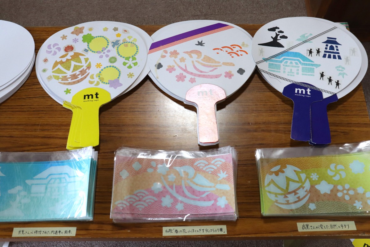 3種類の円通寺にゆかりのある絵柄から1つを選び、アクリル絵の具のステンシルを施して、マスキングテープでデコレーションできるといううものです。良寛さんに馴染み蹴鞠を選んでさっそく作ってみることにしました。