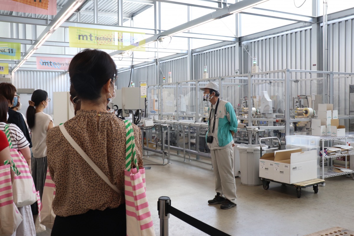 2020年に完成した見学棟は、マスキングテープが実際にでき上ってくるところを真近に見ることができます。説明をしてくださる方のマスクももちろん「mt」でした。